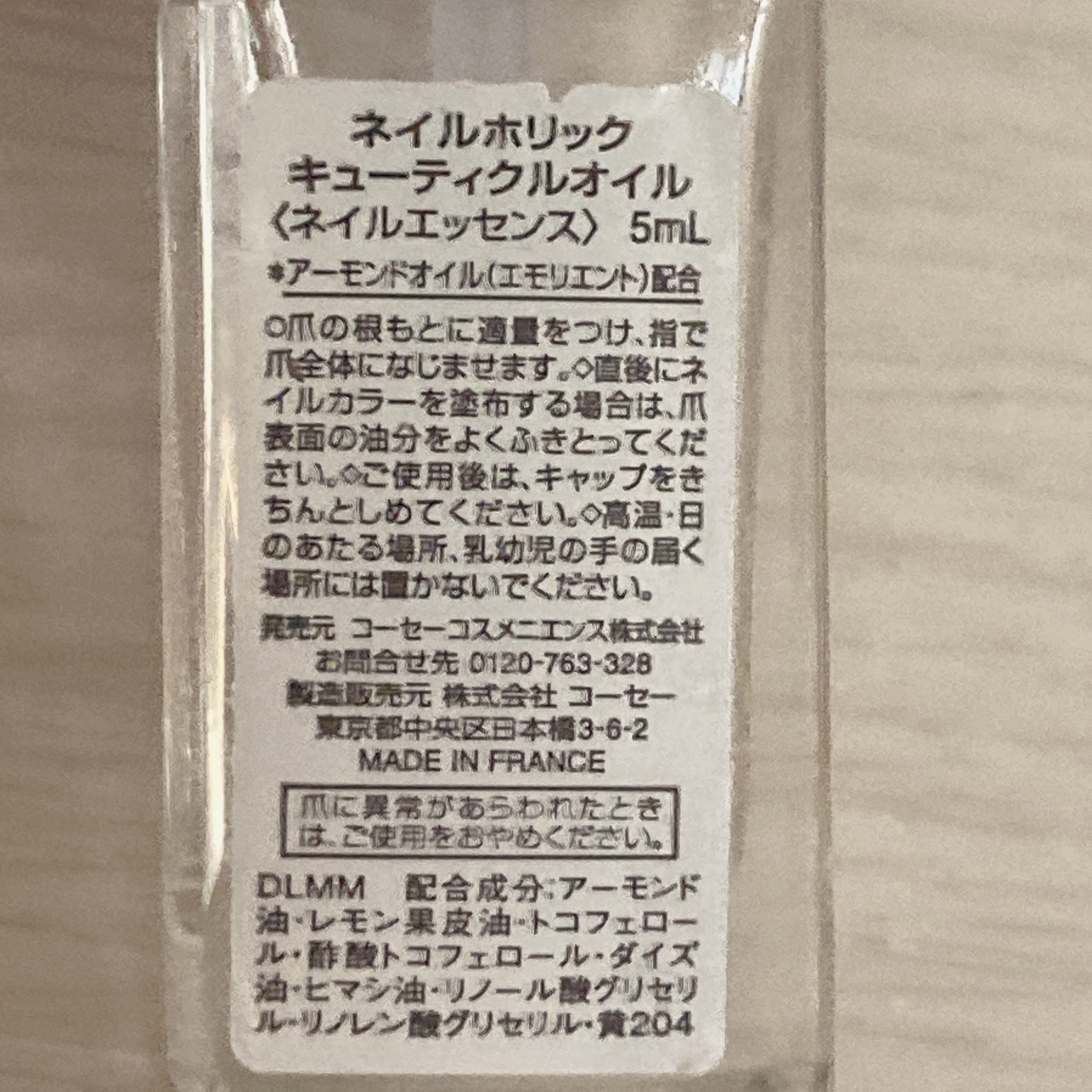 - さらっとなじんでうるおうのに ベタつかない。 乾燥しがちな爪や指先を ケアするキューティクルオイル。 ・ ひと塗りで、爪や甘皮にうるおいを補給。しっとり美しい指先を叶えるキューティクルオイル。 ・ 軽やかにのびて肌なじみが良く、爪先をしっかりケアします。 ・ さらさらとのび広がり、ベタつくことなくご使用いただけます。 ・ ツヤとうるおいにあふれた爪へ仕上げます。 ・ ネイルも美しく映える、すこやかな爪にみちびきます。 ・ ささくれを防いで、美しい指先にみちびきます。 ・ 甘皮をととのえる際にもご使用いただけます。 ・ 気持ちをリラックスさせる柑橘系の香りです。 ・ 無香料