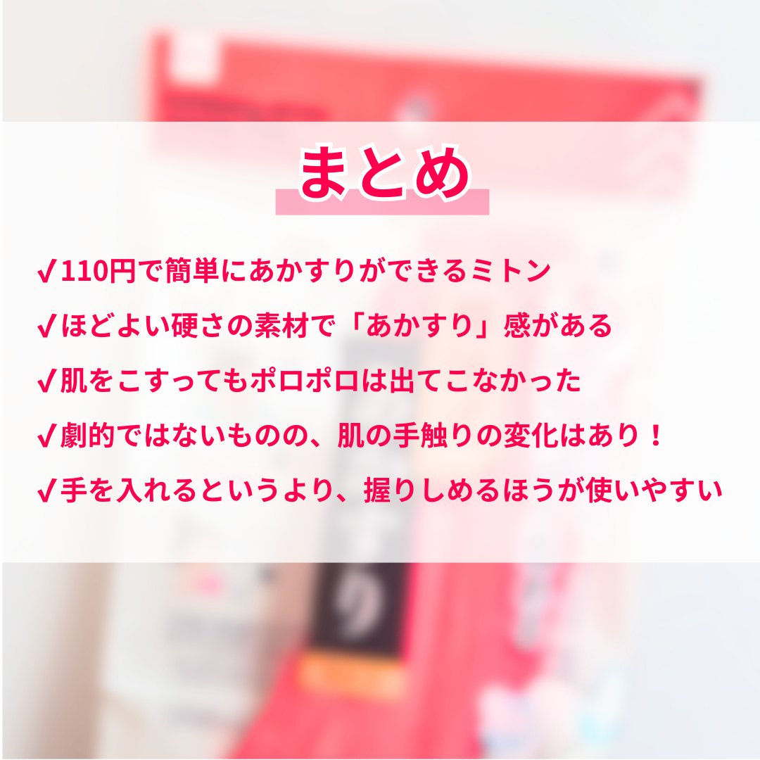 全身の角質ケアに♡手軽にツルツル肌🙌DAISOあかすりミトン¥110バスタイム中に手につけて全身を軽くこするだけ✨ミトンは真ん中が縫われているので指を入れやすくてとっても使いやすい‼︎入浴して肌が柔らかくなった状態で軽く全身を軽くこするだけで...