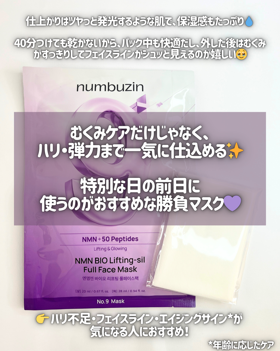 【PR】numbuzinナンバーズインアンバサダー投稿です💜ハリ・弾力ケアでお馴染みの9番ライン✨【9番NMNバイオリフトラッピングマスク】ハリと弾力を一気に仕込んでむくみゼロシートマスク!!上用シート:毛穴・弾力ケアができる純度98%のNM...