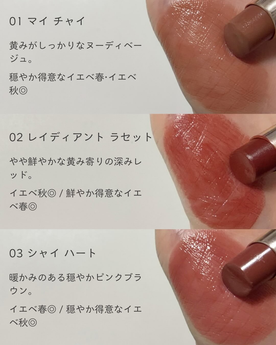 - <01 マイチャイ> テトライソステアリン酸ジペンタエリスリチル、オクチルドデカノール、水添ポリイソブテン、ビスアルキル(C16-18)グリセリルウンデシルジメチコン、ヘキサヒドロキシステアリン酸ジペンタエリスリチル、ジカプリン酸ネオペンチルグリコール、ラウロイルグルタミン酸ジ(フィトステリル/オクチルドデシル)、リンゴ酸ジイソステアリル、パラフィン、イソノナン酸イソトリデシル、合成ワックス、マイクロクリスタリンワックス、ラウロイルグルタミン酸ジ(オクチルドデシル/フィトステリル/ベヘニル)、ホホバ種子油、水添マイクロクリスタリンワックス、トコフェロール、(エチレン/プロピレン)コポリマー、ポリエチレン、ヒアルロン酸Na、(+/-)(チタン/酸化チタン)焼結物、シリカ、セルロース、マイカ、ラウロイルアスパラギン酸Na、ラウロイルリシン、塩化亜鉛、酸化チタン、酸化鉄、水酸化Al、トリイソステアリン酸イソプロピルチタン、トリエトキシカプリリルシラン、合成フルオロフロゴパイト、黄4、青1、赤201、赤202 <02 レイディアントラセット> テトライソステアリン酸ジペンタエリスリチル、オクチルドデカノール、水添ポリイソブテン、ジカプリン酸ネオペンチルグリコール、ビスアルキル(C16-18)グリセリルウンデシルジメチコン、ヘキサヒドロキシステアリン酸ジペンタエリスリチル、リンゴ酸ジイソステアリル、ラウロイルグルタミン酸ジ(フィトステリル/オクチルドデシル)、パラフィン、イソノナン酸イソトリデシル、合成ワックス、マイクロクリスタリンワックス、ラウロイルグルタミン酸ジ(オクチルドデシル/フィトステリル/ベヘニル)、ホホバ種子油、水添マイクロクリスタリンワックス、トコフェロール、(エチレン/プロピレン)コポリマー、ポリエチレン、ヒドロキシステアリン酸エチルヘキシル、ヒアルロン酸Na、(+/-)(チタン/酸化チタン)焼結物、セルロース、ラウロイルアスパラギン酸Na、塩化亜鉛、酸化チタン、酸化鉄、水酸化Al、トリイソステアリン酸イソプロピルチタン、トリエトキシカプリリルシラン、合成フルオロフロゴパイト、黄5、青1、赤201、赤202 <03 シャイハート> テトライソステアリン酸ジペンタエリスリチル、オクチルドデカノール、水添ポリイソブテン、ビスアルキル(C16-18)グリセリルウンデシルジメチコン、ヘキサヒドロキシステアリン酸ジペンタエリスリチル、ジカプリン酸ネオペンチルグリコール、ラウロイルグルタミン酸ジ(フィトステリル/オクチルドデシル)、リンゴ酸ジイソステアリル、パラフィン、イソノナン酸イソトリデシル、合成ワックス、マイクロクリスタリンワックス、ラウロイルグルタミン酸ジ(オクチルドデシル/フィトステリル/ベヘニル)、ホホバ種子油、水添マイクロクリスタリンワックス、トコフェロール、(エチレン/プロピレン)コポリマー、ポリエチレン、ヒアルロン酸Na、(+/-)(チタン/酸化チタン)焼結物、シリカ、セルロース、マイカ、ラウロイルアスパラギン酸Na、ラウロイルリシン、塩化亜鉛、酸化チタン、酸化鉄、水酸化Al、トリイソステアリン酸イソプロピルチタン、トリエトキシカプリリルシラン、合成フルオロフロゴパイト、黄4、青1、赤201、赤202 <04 ルビー ラビリンス> テトライソステアリン酸ジペンタエリスリチル、オクチルドデカノール、水添ポリイソブテン、ビスアルキル(C16-18)グリセリルウンデシルジメチコン、ヘキサヒドロキシステアリン酸ジペンタエリスリチル、ジカプリン酸ネオペンチルグリコール、ラウロイルグルタミン酸ジ(フィトステリル/オクチルドデシル)、リンゴ酸ジイソステアリル、パラフィン、イソノナン酸イソトリデシル、合成ワックス、マイクロクリスタリンワックス、ラウロイルグルタミン酸ジ(オクチルドデシル/フィトステリル/ベヘニル)、ホホバ種子油、水添マイクロクリスタリンワックス、トコフェロール、(エチレン/プロピレン)コポリマー、ポリエチレン、ヒアルロン酸Na、(+/-)(チタン/酸化チタン)焼結物、シリカ、セルロース、マイカ、ラウロイルアスパラギン酸Na、ラウロイルリシン、塩化亜鉛、酸化チタン、酸化鉄、水酸化Al、トリイソステアリン酸イソプロピルチタン、トリエトキシカプリリルシラン、合成フルオロフロゴパイト、黄4、青1、赤201、赤202 <05 ムーンリット モーブ> テトライソステアリン酸ジペンタエリスリチル、オクチルドデカノール、水添ポリイソブテン、ビスアルキル(C16-18)グリセリルウンデシルジメチコン、ヘキサヒドロキシステアリン酸ジペンタエリスリチル、ジカプリン酸ネオペンチルグリコール、ラウロイルグルタミン酸ジ(フィトステリル/オクチルドデシル)、リンゴ酸ジイソステアリル、パラフィン、イソノナン酸イソトリデシル、合成ワックス、マイクロクリスタリンワックス、ラウロイルグルタミン酸ジ(オクチルドデシル/フィトステリル/ベヘニル)、ホホバ種子油、水添マイクロクリスタリンワックス、トコフェロール、(エチレン/プロピレ