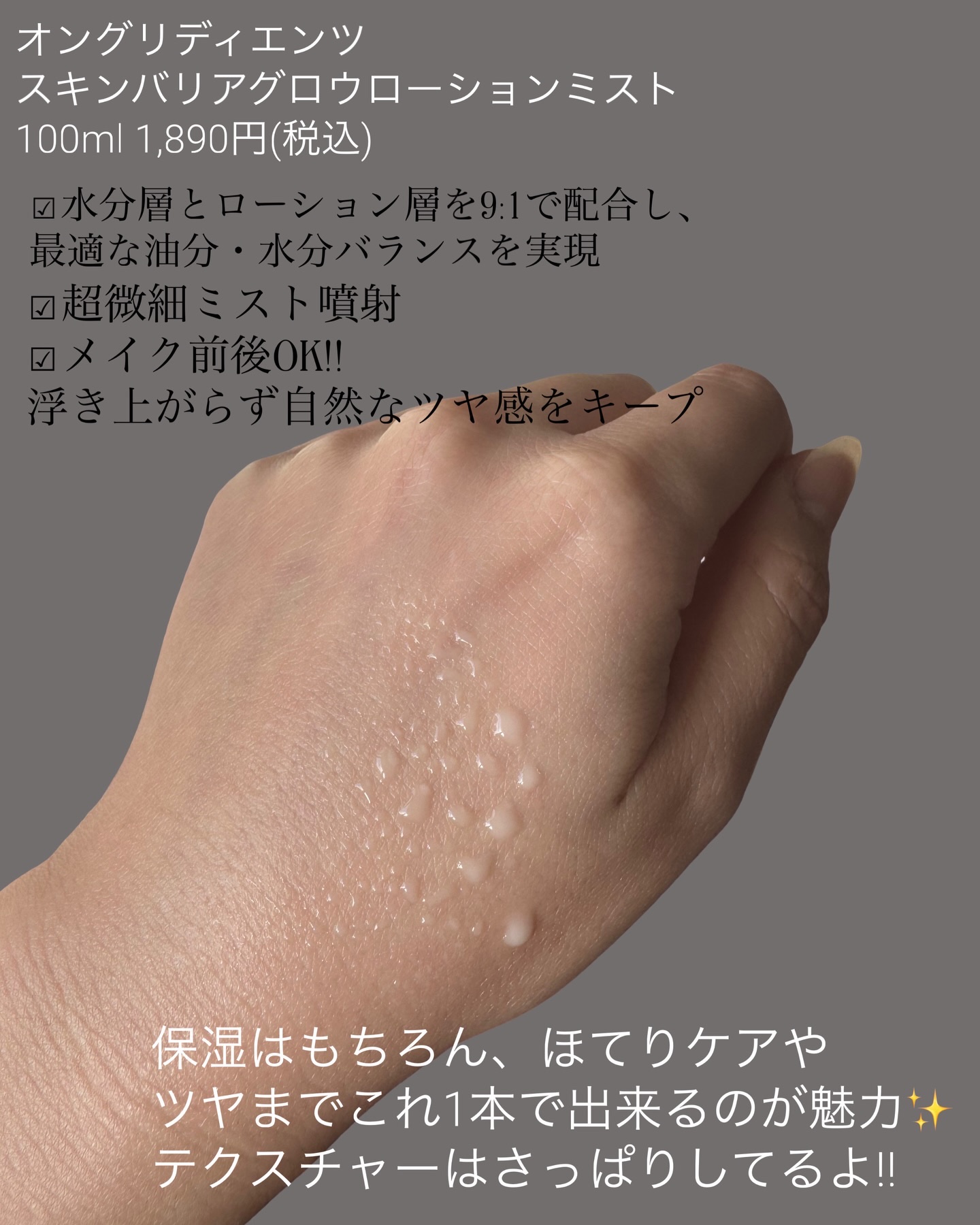 ✨オングリディエンツベストセラーローションミストレビュー✨韓国オリーブヤングで1位を獲得した、あのベストセラーローションがミストタイプで新登場!水分層とローション層を9:1で配合し、最適な油分・水分バランスを実現。超微細ミストが肌全体にふんわ...