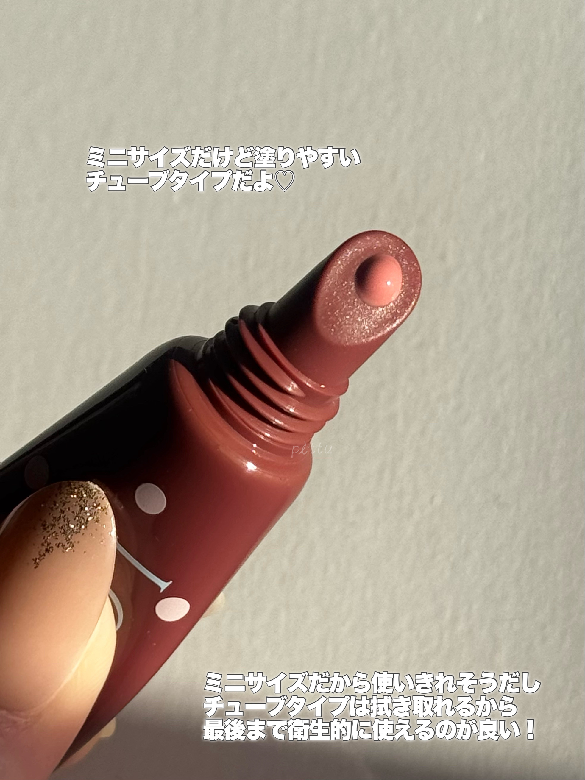 カラバリは2色展開、公式情報がないので不安ですがどうやら限定販売のようです! 01 プリュムフラワー ピンクベージュ系でまとめられたパレット 全体的にライトなピンクが多く、イエベ春の方向きに感じます 02 ボヌールマロン 赤みのあるカラーでまとめられたパレット 明るいカラーもありますがベージュや赤みブラウン等イエベ秋の方向きに感じます 表面のエンボス加工もかわいいのばっかりですね! ラメ強めが格子柄だからわかりやすいし、まとまりが良い⸜(๑⃙⃘'ᵕ'๑⃙⃘)⸝⋆* ちなみにこちらのパレットは8色も入っているのにかなりコンパクトで、1色の大きさが私の親指の爪よりちょい大きめという嬉しさ…! フタの水面のデザインは内側だけに施されているので、表面はツルッとしていますよ🌊 チップもふわふわで、多色パレット専用のサイズ感で長めなのが嬉しい♪ とにかく話題になっているこちら、可愛すぎるから在庫無くなるのお願い待って…🙏🏻💦