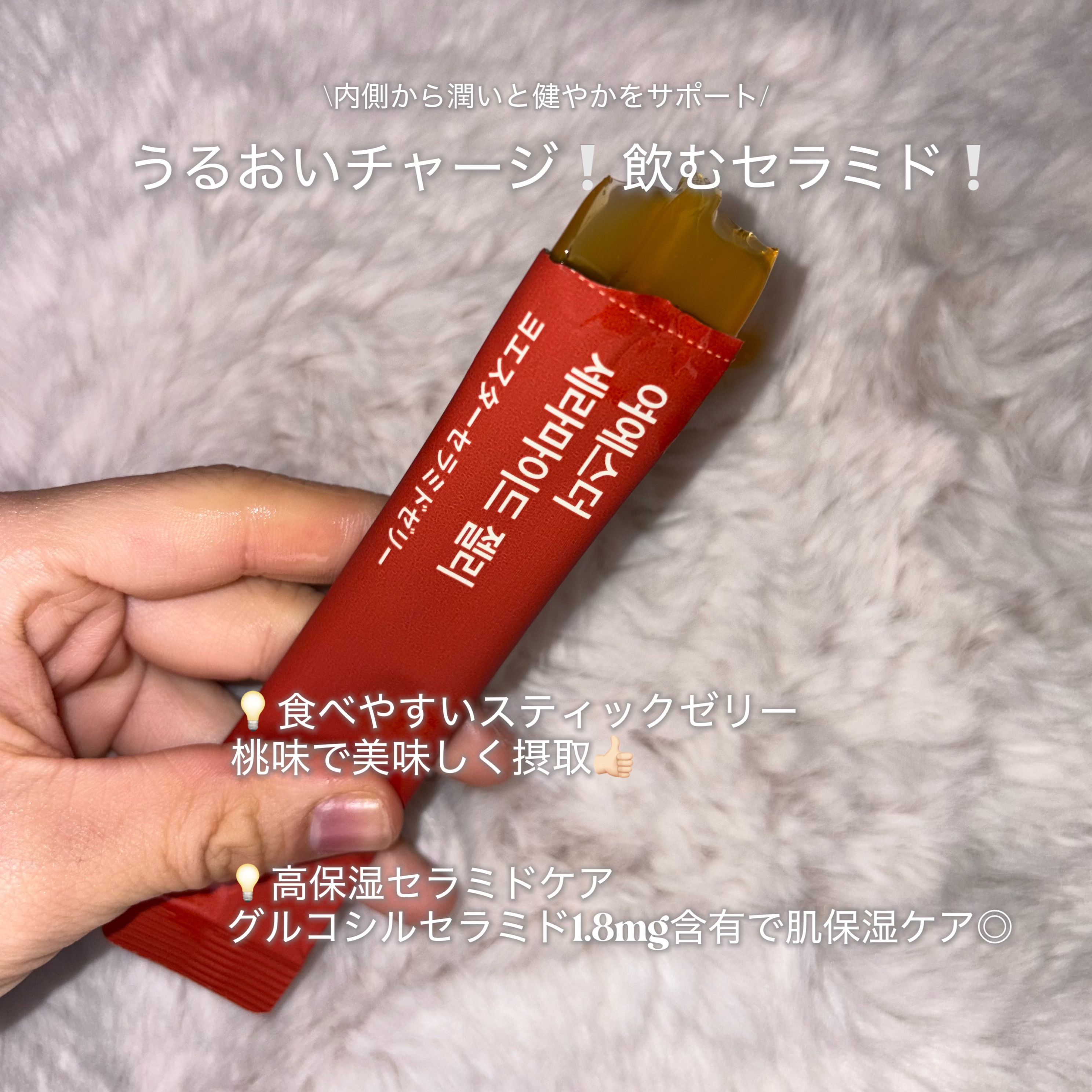 - 飲む植物性セラミド。ゼリーテクスチャーでおいしく摂取するこんにゃく芋エキスグルコシルセラミド。