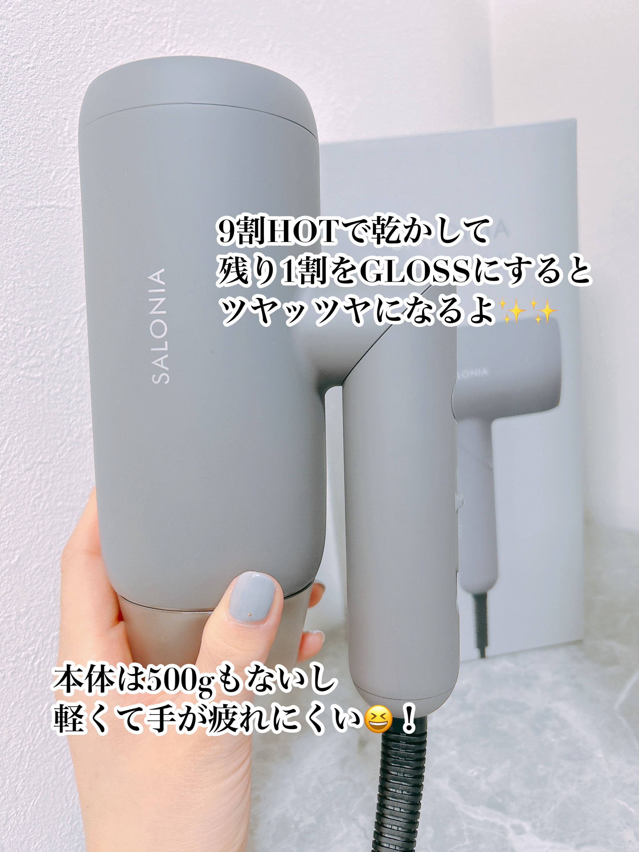 【SALONIA】 スムースシャインドライヤー 🩶グレーSALONIAサロシリーズのなかでもワンランク上の仕上がり✨⬜️2.4㎥/min※の大風量→吹出口の形状を変えることで、風の当たる面積を広げ、低温なのに速...