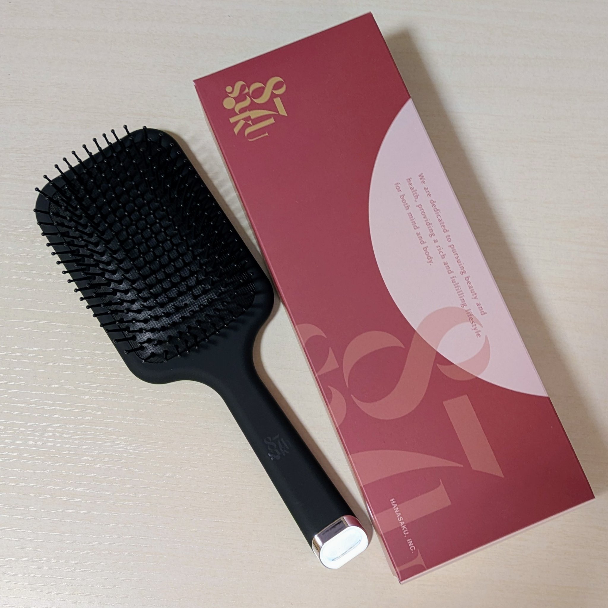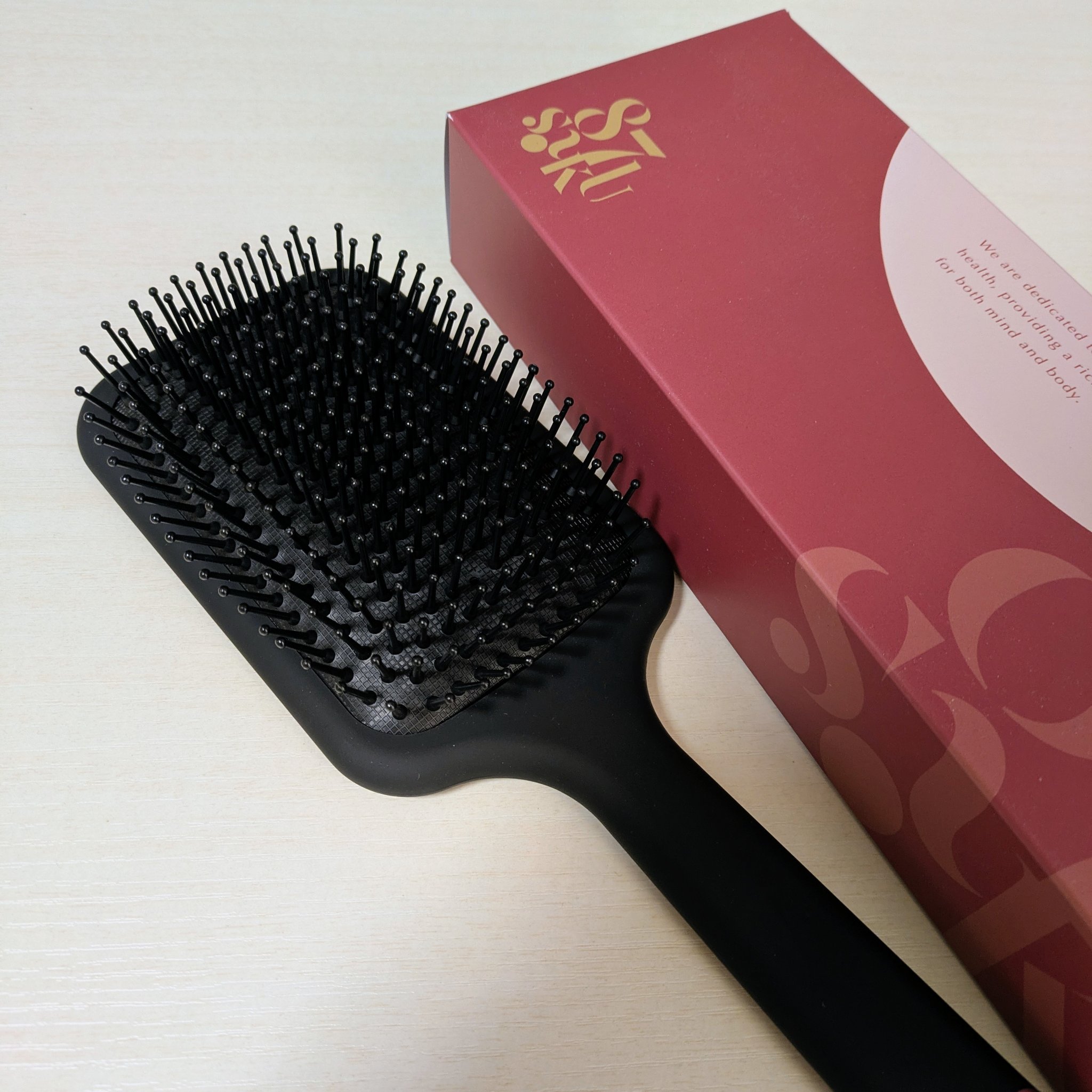 - 広いクッション面が頭皮をやさしい使い心地で刺激。髪の流れを整えながら摩擦を抑え、ツヤとまとまりを守ります。 夜のリラックスタイムにも、朝のスタイリング前にも使えます。 髪と頭皮を整える、癒しの時間を。