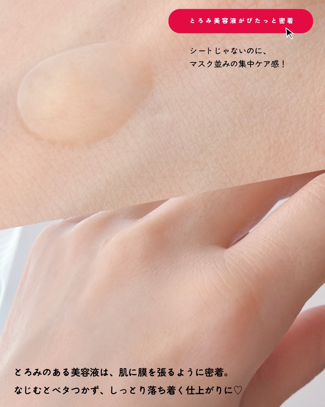 | 糸を引くくらい濃密で とろみのあるテクスチャー。 肌に膜がはったような密着感があり、 その後肌にすーっとなじんでベタつかない。 | 詳細を見る | |