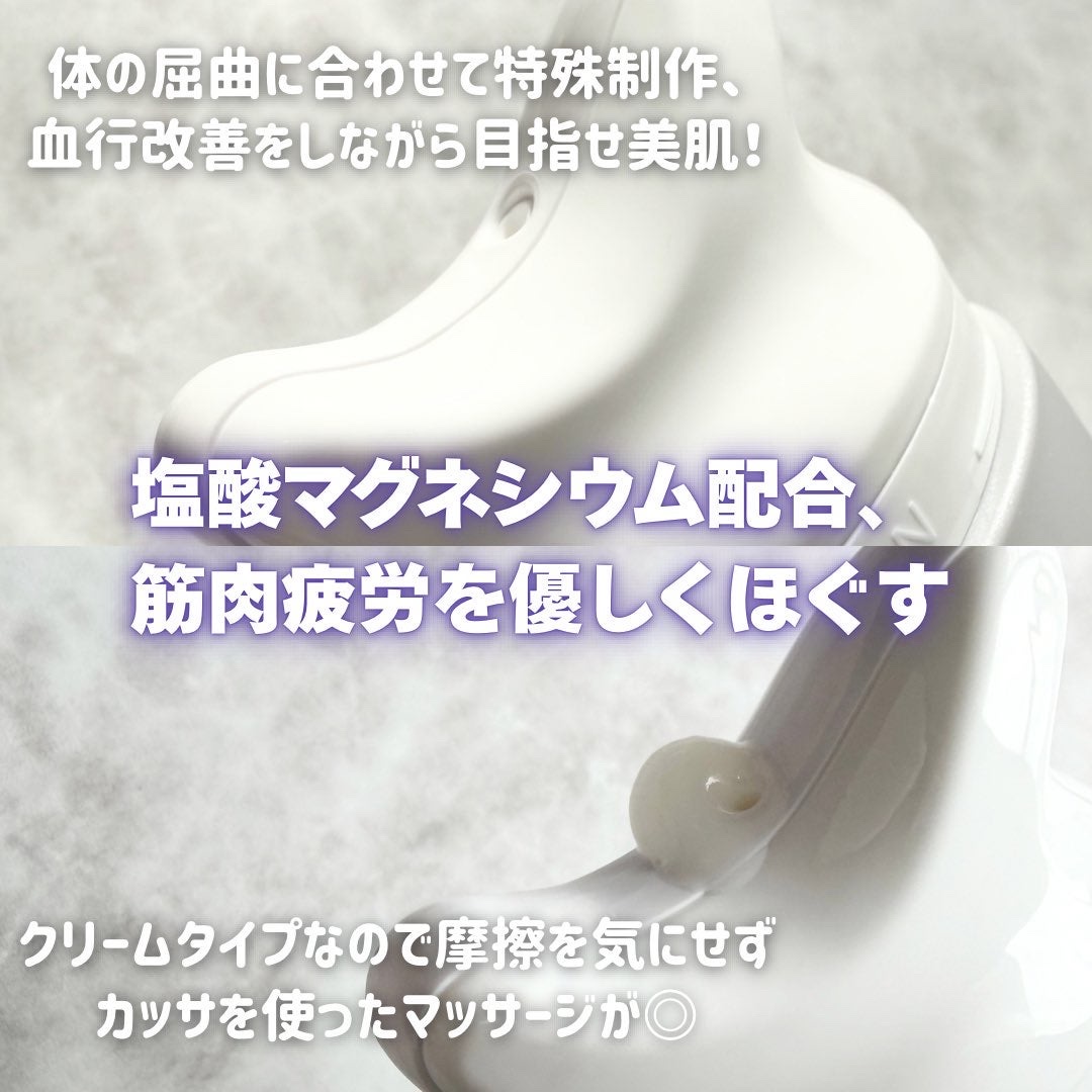 - ふくらはぎをケアするボディカッサマッサージクリームです。じんわり感じられる温熱感とカッサマッサージしやすいテクスチャー、ボディラインにぴったりのカッサティップ、グリップ感の良い容器などが特徴で、マッサージによるお肌の血行促進をサポートします。
