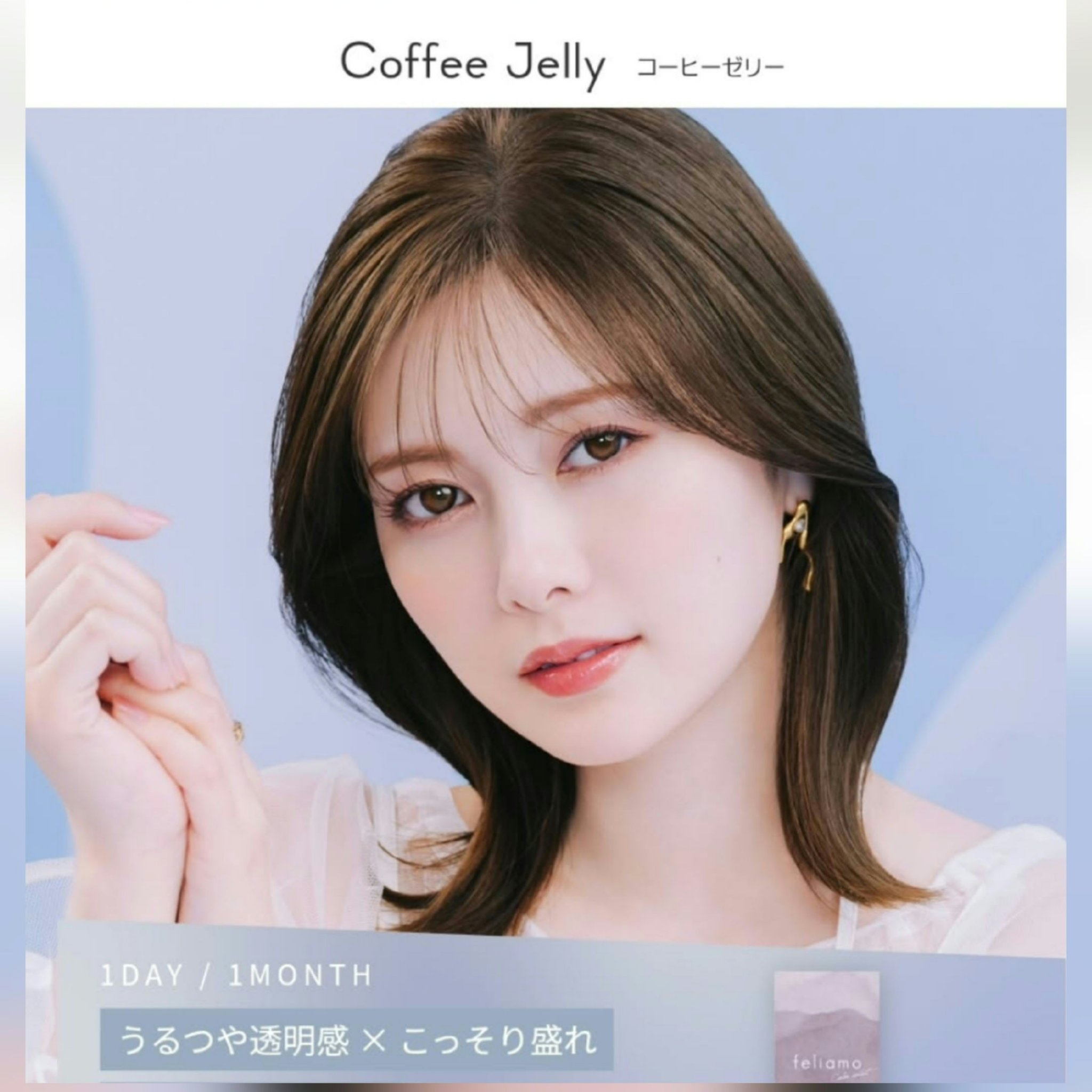 - ※2025年6月以降、商品パッケージ裏面・側面の一部表記を順次変更いたします。尚、これにかかる商品の交換・返品は承っておりません。 どんな瞬間にも溶け込む誰からも愛される瞳へ feliamoの由来は felice amore~幸せな愛~ 瞳から愛されオーラを放つ好印象レンズで女性らしさと品を演出。 オンも、オフも、特別な日も。 どんな場面にも溶け込むレンズラインナップで誰からも愛される瞳に。 ■うるつや透明感 × こっそり盛れ ナチュラルレンズ Coffee Jelly(コーヒーゼリー) ■じゅわっと透明感 × ふんわり盛れ すこし大きめレンズ Affogato(アフォガード) ■ナチュラル細フチ×裸眼盛れ トキメキうるみレンズ Oolong Tea(ウーロンティー) ■トレンド太フチ×くりっと盛れ 無敵ブラウンレンズ Tarte Tatin(タルトタタン) ■じゅわっとフチ×甘かわ盛れ あざとブラウンレンズ Tiramisu Ring(ティラミスリング) ■シュガーパール 大人気カラーBrulee Pearl(ブリュレパール)の色違いグレーレンズ! 細フチの使いやすいグレーで、どんな瞳の色(黒目・茶目)でもナチュラルに光をとりこみ、うるっと奥行きのあるこなれ可愛い印象に。 おでかけにぴったりなレンズです! 清楚な瞳になれるヒ・ミ・ツは・・・? ちゅるん細フチ×うるキラグレーカラー! ■メルティバター 盛れるのにバレにくい、毎日使えるナチュラルブラウンレンズ! じゅわっととろけるようなブラウンで、ふんわりやさしげな瞳に! どんなメイクにも似合うから毎日使える!自然に盛れる大きめブラウンレンズはfeliamoにお任せ♡ 多幸感のある印象の瞳のヒ・ミ・ツは・・・? ぼかしナチュラルブラウン×じゅんわりとろけるブラウンカラー カラーコンタクトレンズの不適正使用による眼障害の危険性等などがあります。 ●コンタクトレンズは高度管理医療機器です。不十分な洗浄・消毒など不適切なケアや、長時間・交換期間を超えた装用により、アレルギー性結膜炎、角膜感染症、角膜潰瘍等の重篤な眼障害が発生する危険性があります ●ご使用前に取扱説明書を確認してください 使用上の留意事項 ●眼科医院等を受診してからお求めください ●眼に異常を感じたら直ちにレンズ使用を中止し、お近くの眼科等で診察を受けてください ●医師の指示にしたがってご使用ください ●コンタクトレンズを装用する場合、自覚症状がなくても、眼科医院等での定期検査を受けてください ●レンズに不具合がある場合は使用しないでください