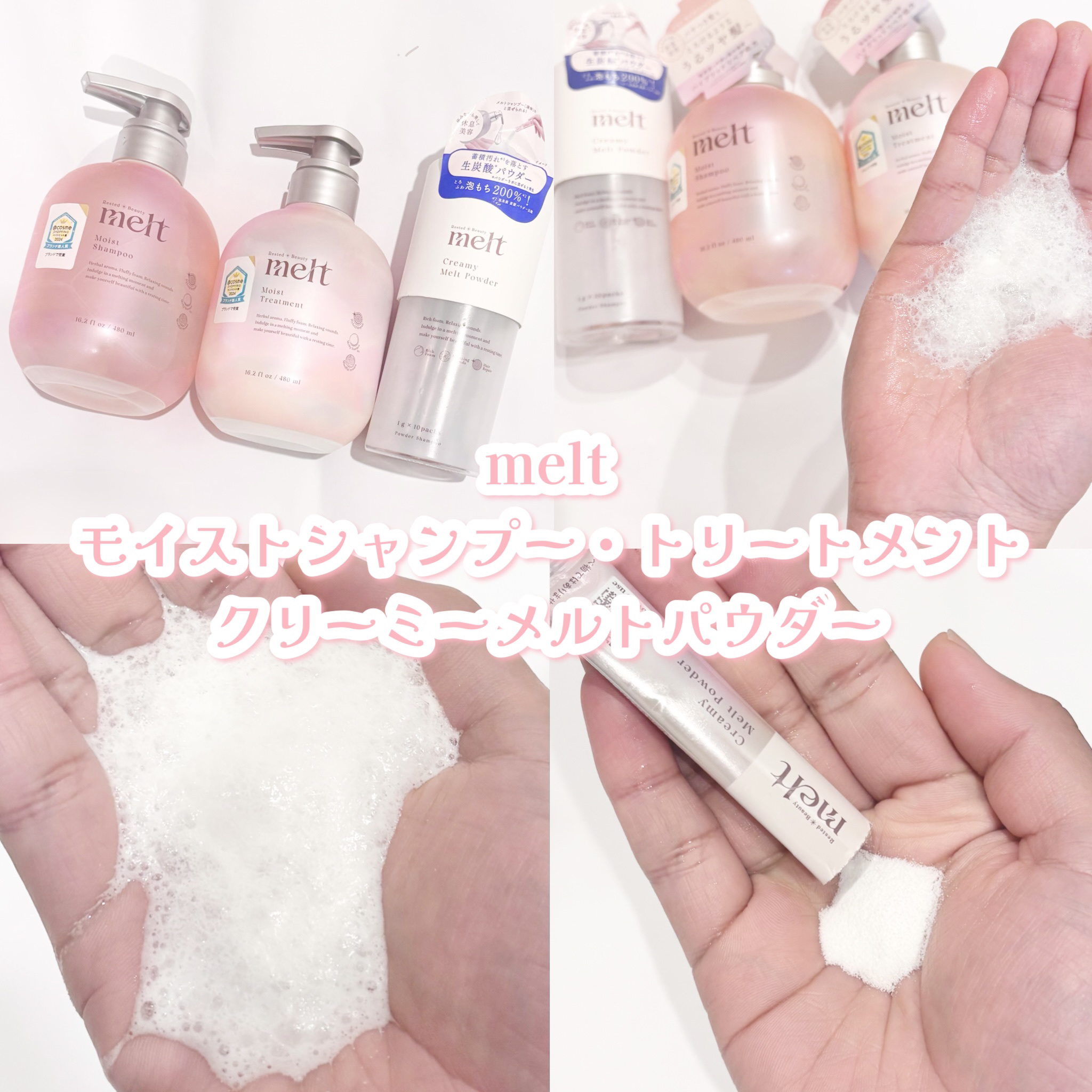 瑞々しくやわらかいとろけるようなツヤ髪に✨話題のmeltシャントリ&改良新発売の炭酸パウダーmelt【メルト】モイストシャンプー/トリートメント480ml各税込1,760円(投稿者調べ)クリーミーメルトパウダー1g×10包税込1,980円(投...