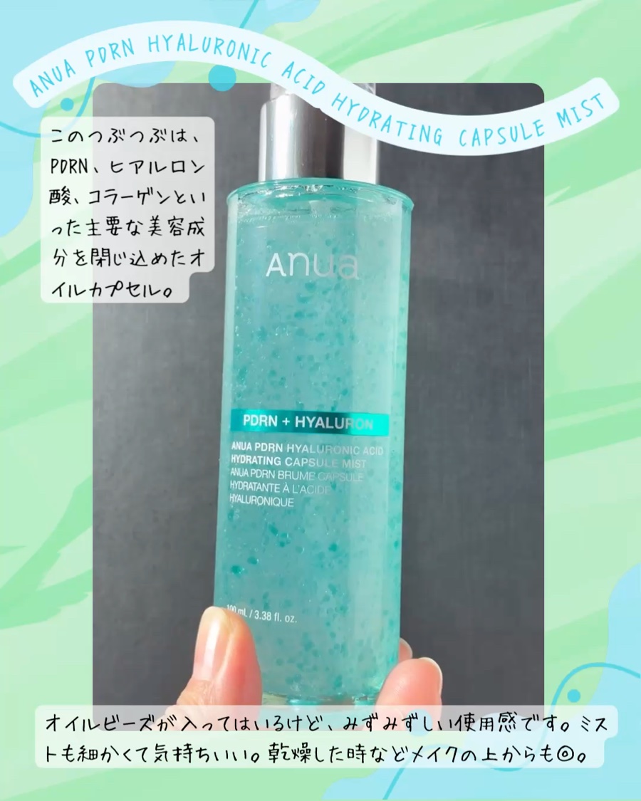 - 今回登場する「PDRNヒアルロン酸ハイドレイティングミスト」は、肌にうるおいやハリを与える「ヒアルロン酸*¹」「コラーゲン*²」「PDRN*³」を閉じ込めたANUA PDRN CAPSULE™配合の保湿ミストです。スプレーした瞬間に、エメラルド色のグロウオイルビーズが均一に広がり角質層のすみずみまで水分を満たし、うるおいによってツヤのある水光肌を演出します。 ①心地よいしっとり感を目指すレイヤリング処方 ウォータリーエッセンスとグロウオイルビーズを組み合わせ、軽やかな使い心地とうるおい感を両立。ヒアルロン酸*¹+コラーゲン*²+PDRN*³配合のANUA PDRN CAPSULE™が、ミストを振ることで肌の上でやさしくはじけて角質層までうるおいを届けます。 ②乾燥が気になる季節のうるおいケアに 季節の変わり目や冷暖房による乾燥環境でも、表面だけの保湿にとどまらず、肌の内側*4からしっとり感をキープ。乾燥によるくすみやごわつきをケアし、うるおいによる透明感のある肌へ。 ③メイク前後どちらも使えるスキンケアミスト メイク前後の保湿ケアとして活用可能。メイク前の使用ではキメを整えることでメイクノリをサポートし、メイク後の使用ではツヤ感をプラスし、メイクの仕上がりをサポートします。 ④年齢に応じたスキンケアのサポートにも PDRN*³を2000ppm配合し、うるおいとハリ感を同時にケア。乾燥による気になる目元・口元・首などへの使用もおすすめです。 *1 加水分解ヒアルロン酸(整肌成分) *2 加水分解コラーゲン(整肌成分) *3 DNA-Na(整肌成分) *4 角質層まで 2025年11月1日(土)よりQoo10メガポにて先行発売