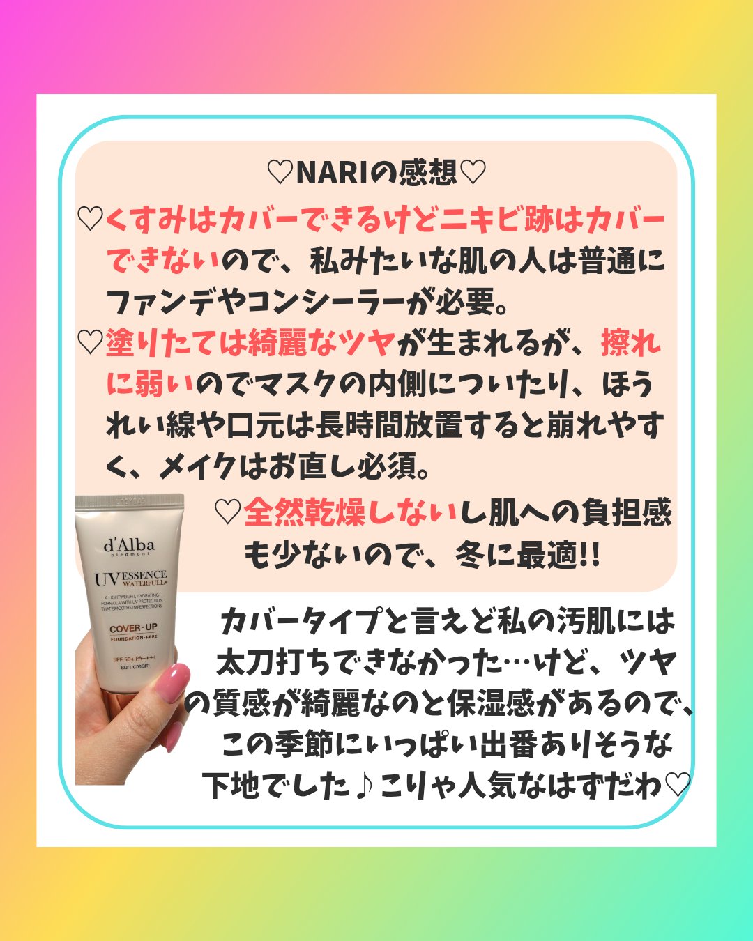 私みたいにニキビやニキビ跡のある肌がサンプルじゃなきゃ、カバー力メイクに説得力は無いと昔から思ってました。 NARI(ナリ)、ニキビ肌暦30年。自分のニキビ肌・毛穴肌で検証するカバー力メイクや本音コスメレビューなどを投稿しています。 日々お役立ち情報を発信していますので、ぜひぜひフォローして参考にしてくださいね💖