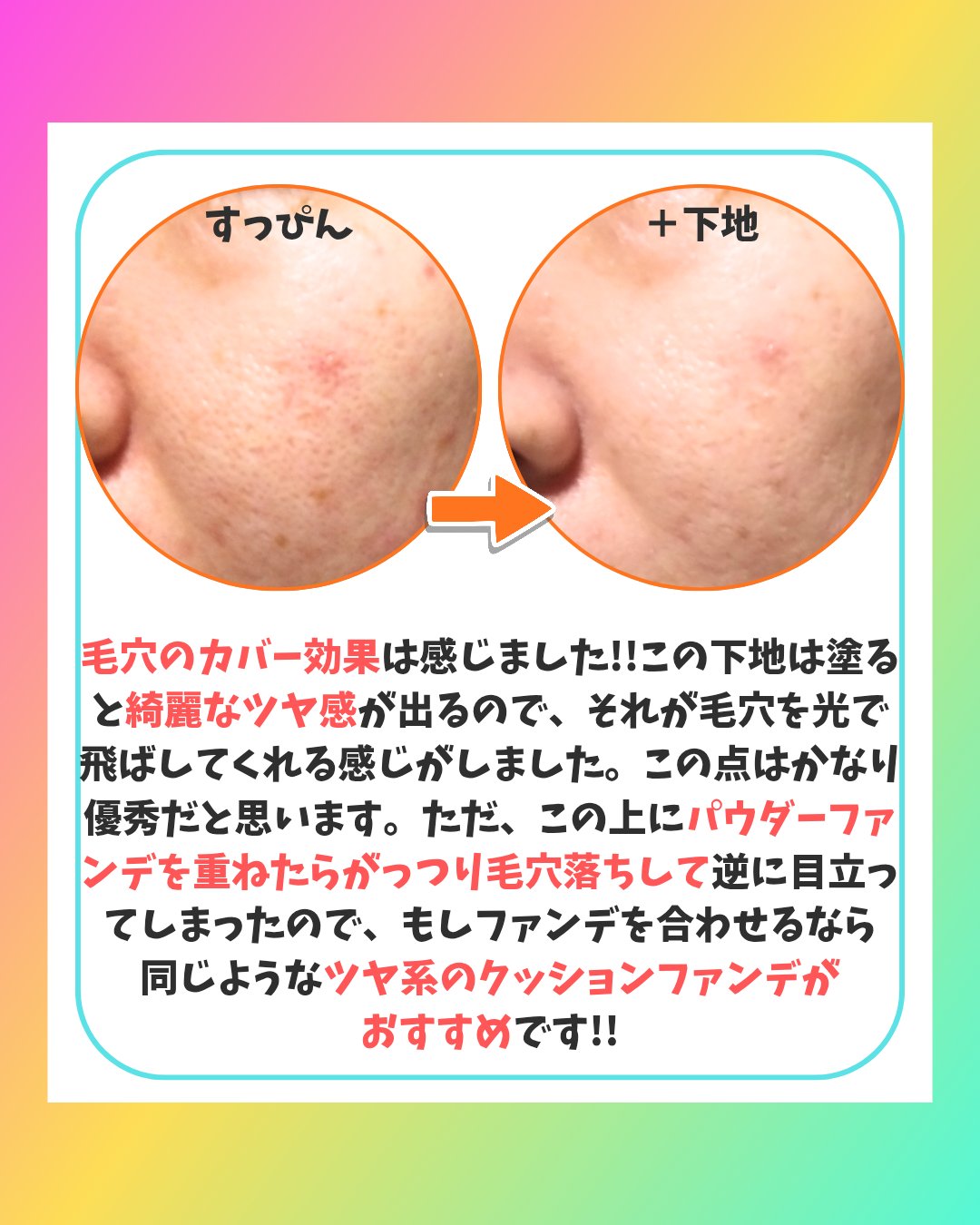 以前ヘアメイクアーティストの小田切ヒロさんもお勧めしていたことでも有名なこの下地。 このお値段でこの仕上がりはなかなか優秀だなぁと思いました😄 毛穴用下地は毛穴肌の私にとって必要不可欠で他にもいろいろ持ってるので、そのうち使い比べて投稿してみたいな。