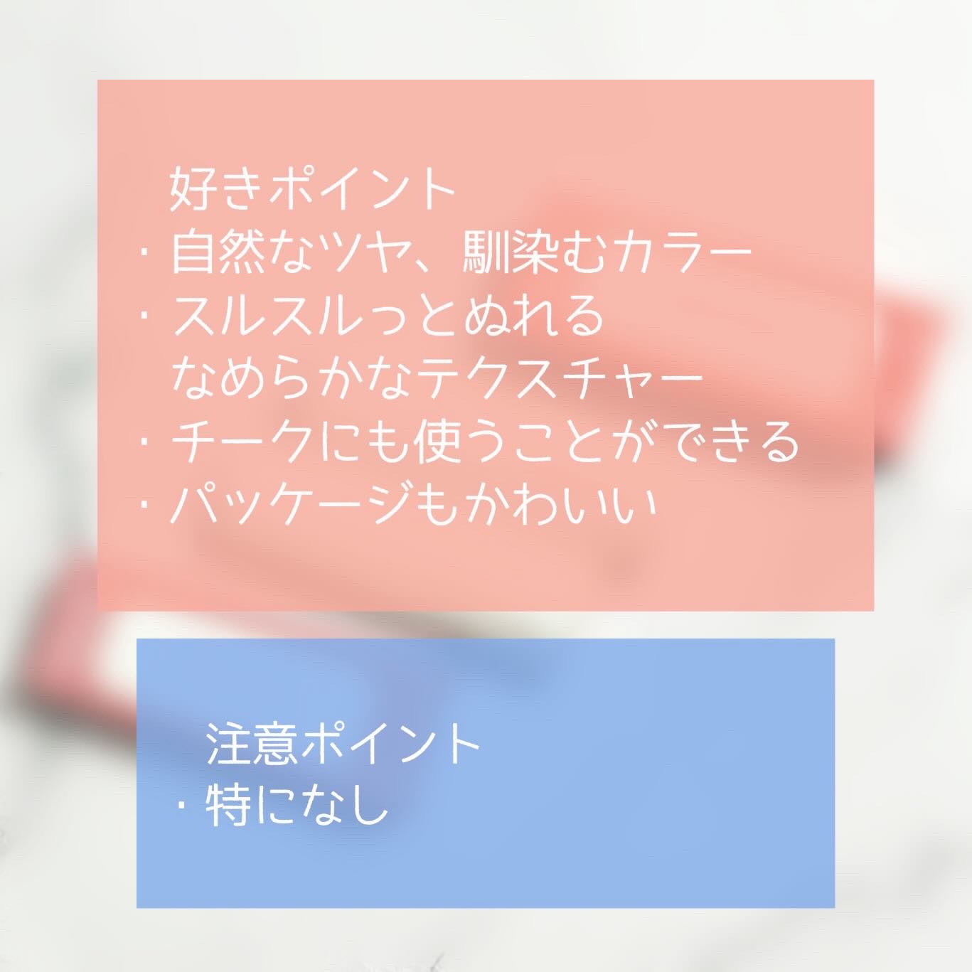 | 口紅・グロス・リップライナーランキング第6位 | ササっと塗ればシアーだし、2、3度 重ね塗りするとちゃんと色付きます。 | 詳細を見る | |