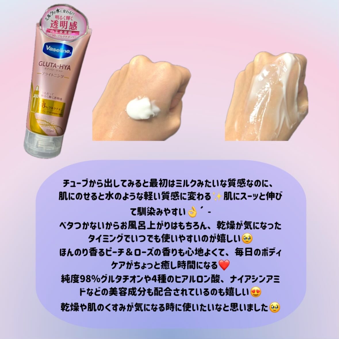 ヴァセリンGLUTA-HYA(グルタヒア)ボディローション ブライトニング純度98%グルタチオン配合のボディローションジェルクリームのようなテクスチャー手に取り出した時はボディローションよりボディ乳液に近い印象でしたでも伸ばしてみる...