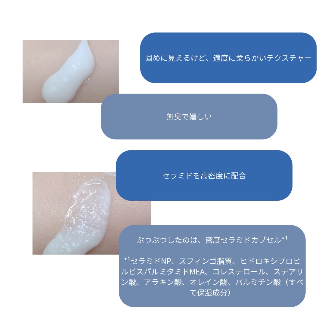 - 独自技術を用いた「高密度セラミドカプセル*¹」を1本に約100万個配合しそのつぶつぶと目に見えるカプセルが肌上で柔らかく溶けて角質層のすみずみまでうるおいで満たします。 保湿が120時間*⁵持続することでも人気を博しており乾燥しやすい敏感な肌におすすめのクリームです。 無香料、無着色、パラベン無添加、エタノール無添加、皮膚科医の協力のもとテスト済み*⁶ *1 セラミドNP、スフィンゴ脂質、ヒドロキシプロピルビスパルミタミドMEA、コレステロール、ステアリン酸、アラキン酸、オレイン酸、パルミチン酸 *5 ㈱エリード 2023.2.20~2023.3.23 敏感肌で乾燥悩みのある女性32人対象の人体適用試験実施(個人差があります) *6 全ての人に肌トラブル、アレルギーがおきないわけではありません。