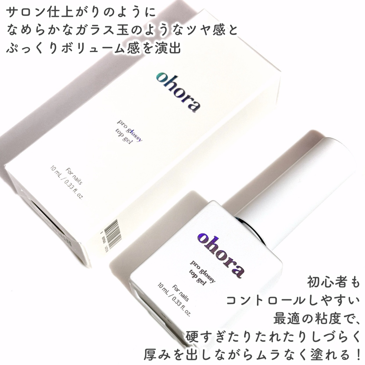 - ネイルに自然なツヤと長持ちさせる効果を与えるトップジェルです。 Ohoraプログロッシートップジェルでガラス玉のツヤ感と維持力を高めてみてください。 アメリカデュポン社の最高級のブラシを使いました。ムラなく塗れるので筆のタッチ感が残らないために初心者の方もすぐお使いいただけます。