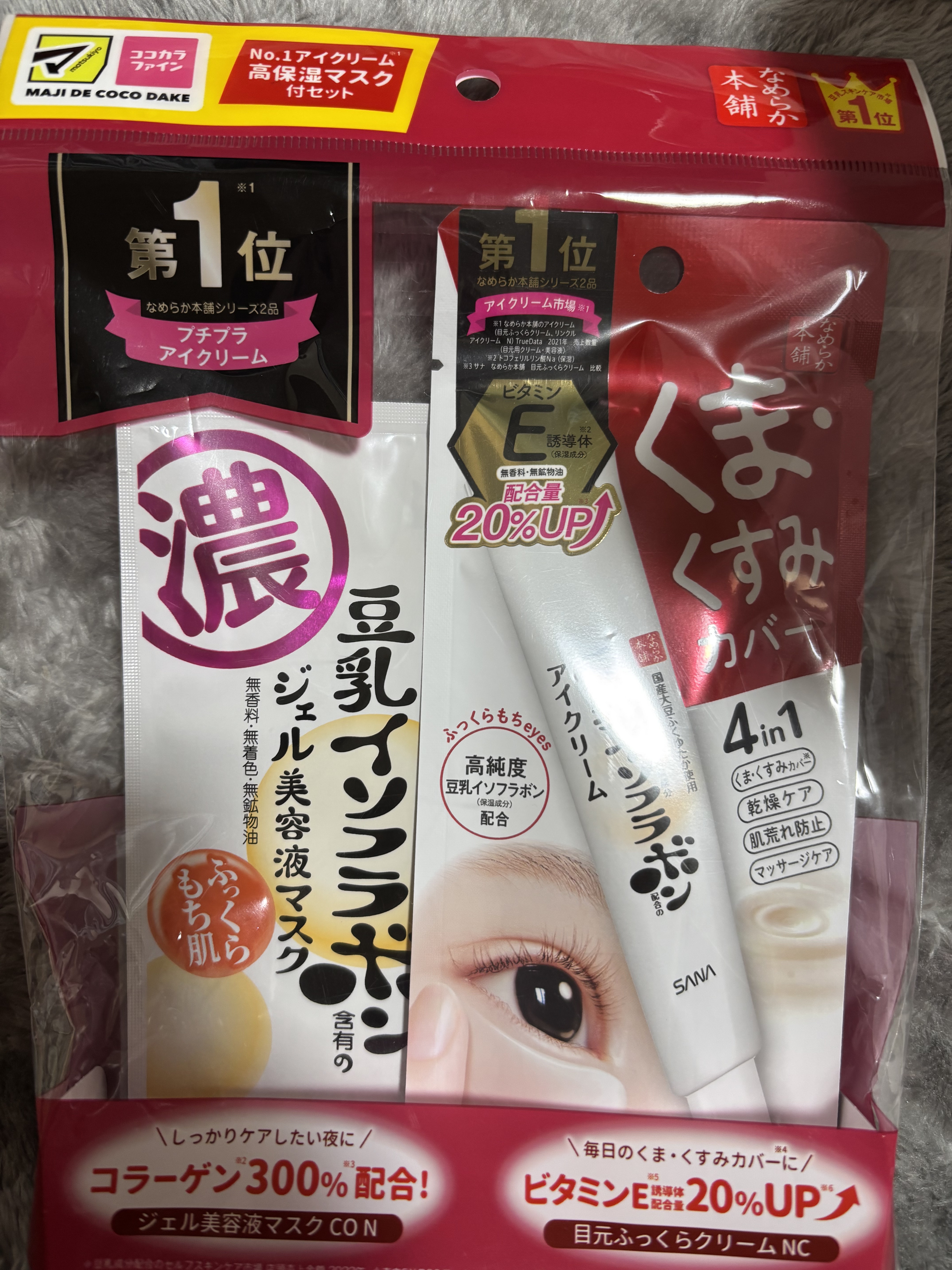- <目元ふっくらクリーム NC> 水、グリセリン、スクワラン、テトラエチルヘキサン酸ペンタエリスリチル、BG、テトラ(ヒドロキシステアリン酸/イソステアリン酸)ジペンタエリスリチル、ジメチコン、ベヘニルアルコール、PEG-150、ジイソステアリン酸ポリグリセリル-2、ジグリセリン、ミツロウ、イソステアリン酸PEG-60グリセリル、ペンチレングリコール、ステアリン酸グリセリル、トコフェリルリン酸Na、トリメチルシロキシケイ酸、豆乳イソフラボン、豆乳発酵液、(アクリレーツ/アクリル酸アルキル(C10-30))クロスポリマー、エタノール、エチルヘキシルグリセリン、キサンタンガム、シクロデキストリン、ダイズイソフラボン、ダイズタンパク、ダイズ種子エキス、トコフェロール、トリ(カプリル酸/カプリン酸)グリセリル、ポリソルベート80、マカデミア種子油、ラウリルカルバミン酸イヌリン、レシチン、酸化チタン、水酸化Na、フェノキシエタノール、メチルパラベン <目元ふっくらクリーム【旧】> 水、BG、グリセリン、トリエチルヘキサノイン、テトラ(ヒドロキシステアリン酸/イソステアリン酸)ジペンタエリスリチル、ジメチコン、ベヘニルアルコール、テトラエチルヘキサン酸ペンタエリスリチル、ミツロウ、ラウロイルグルタミン酸ジ(オクチルドデシル/フィトステリル/ベヘニル)、マカデミア種子油、ジフェニルシロキシフェニルトリメチコン、イソステアリン酸PEG-60グリセリル、ステアリン酸グリセリル、トコフェリルリン酸Na、豆乳発酵液、ダイズ種子エキス、ダイズタンパク、(アクリル酸ヒドロキシエチル/アクリロイルジメチルタウリンNa)コポリマー、エタノール、エチルヘキシルグリセリン、カンゾウ根エキス、ジメチコンクロスポリマー、スクワラン、セルロースガム、トコフェロール、ポリソルベート60、マイカ、酸化チタン、フェノキシエタノール、メチルパラベン