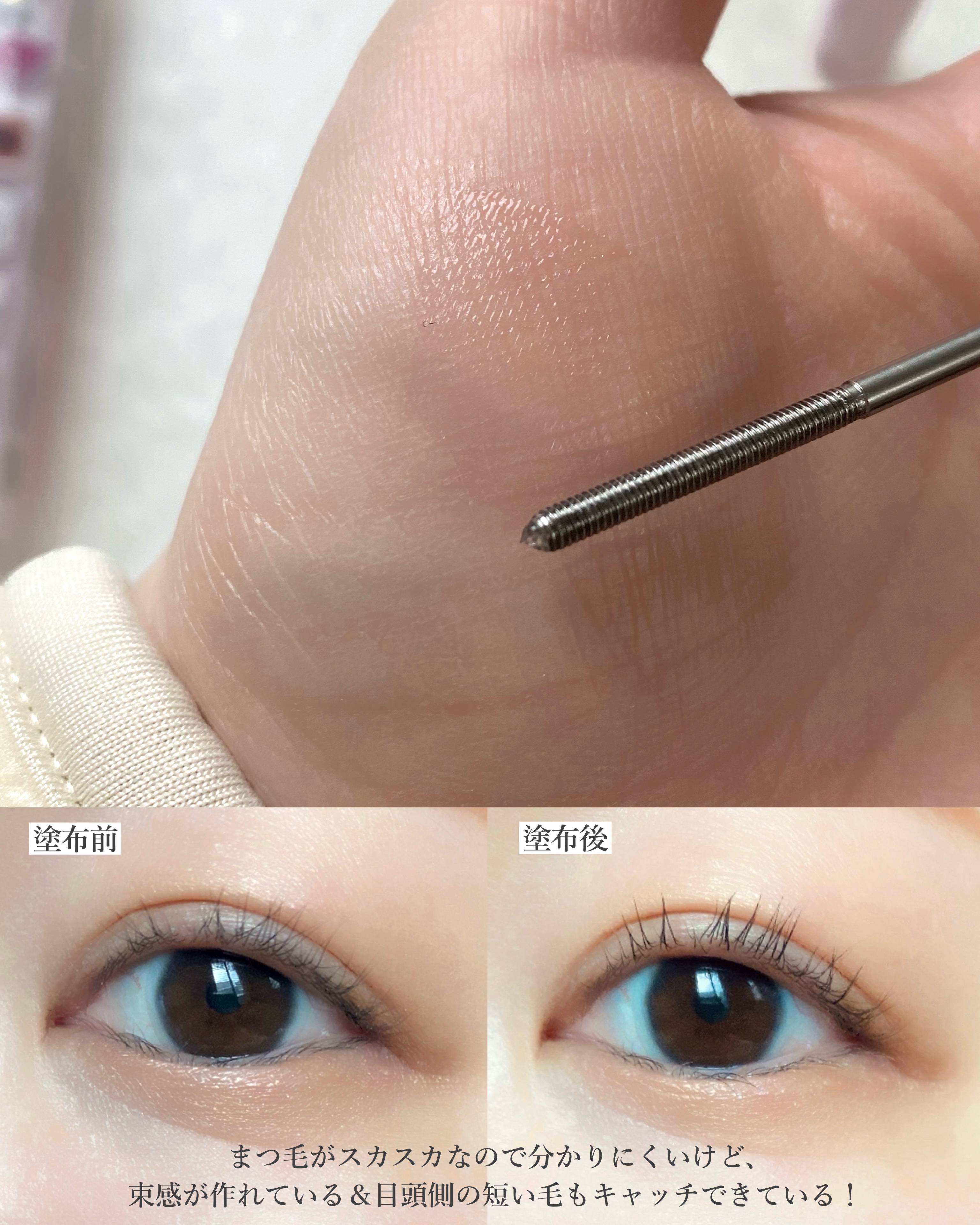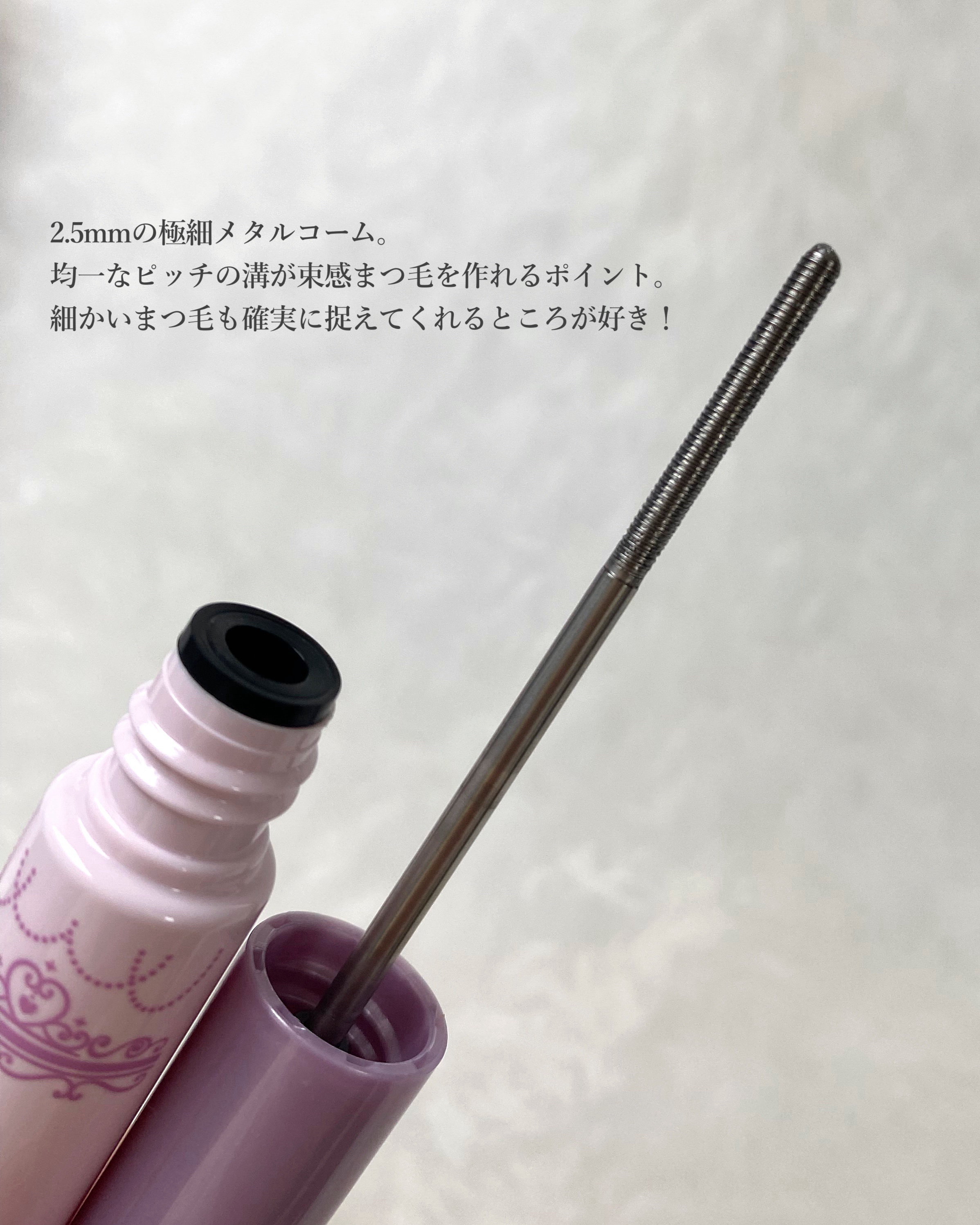 - まつパ風のナチュラル束感まつげに💗 メタルックマスカラの透明タイプが登場✨ 金属コームが特徴のメタルックマスカラの透明タイプ。 ナチュラルな束感まつげに仕上げることができ、 メイクしている感なく自然に盛れちゃいます♪ 束感のあるまつげをつくるために設計された金属コーム。 均一なピッチが、程よく数本のまつげを束ねて スーッと伸ばすだけで綺麗な束感のまつげが完成👏 極細コームで、目頭や目尻のまつげにも塗りやすい♪ 水・汗・皮脂に強く、きゅるんとカールがずっと長持ち! 繊維無配合です。 【自分好みのスタイリングが可能】 《単品》 すっぴんから可愛い風のナチュラル束感をつくるクリアマスカラに。 《下地》 本品の塗布後、上から別のマスカラを使用して自然な束感まつげが作れる "仕込む束感下地"に。 《トップコート》 別のマスカラを塗布した後の毛流れの調整・コーティングに。