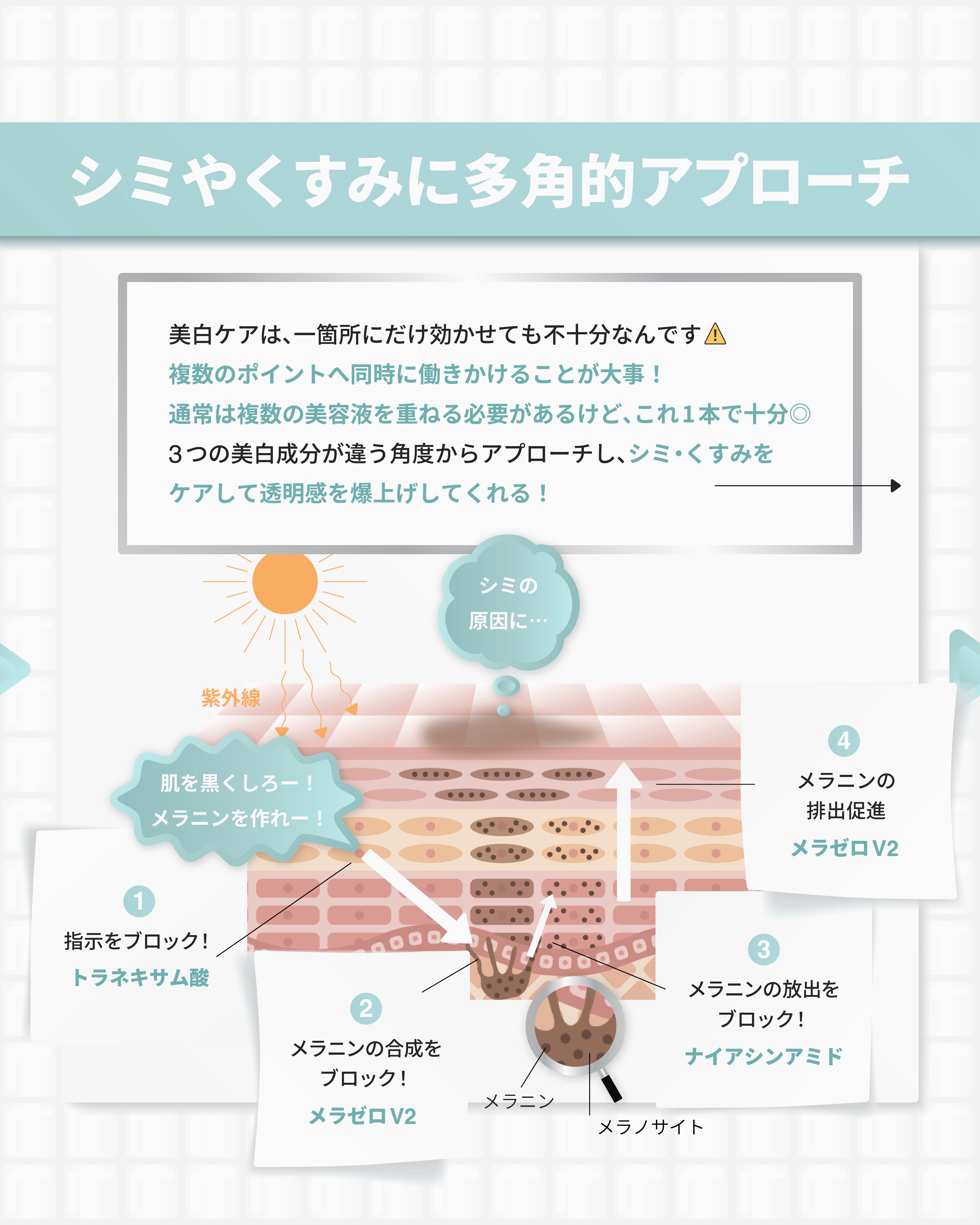 +@celimax.japan・ポアブライトニングシミケアセラム3重メラニンケア成分高含量処方でトラネキサム酸、ナイアシンアミド、メラゼロV2のほかに植物由来ヒアルロン酸も配合とろみのあるみずみずしいテクスチャーのセラムはベタつきなくしっとり...