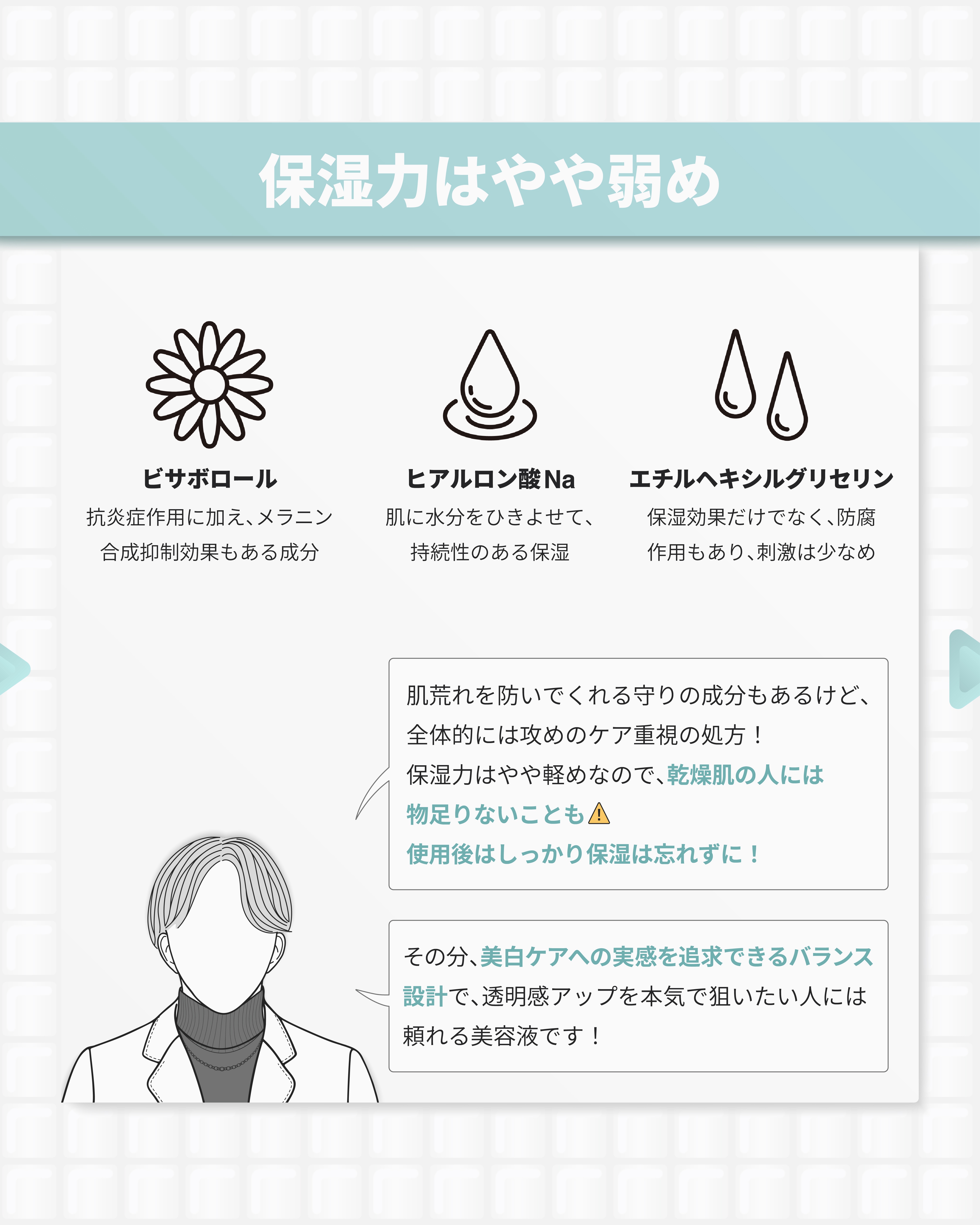- <30ml> 精製水、グリセリン、BG、ナイアシンアミド、トラネキサム酸、1,2-ヘキサンジオール、メ チルプロパンジオール、ビニルジメチコン、グリセレス-26、イソノナン酸イソノニル、ビワ葉エキス、ミドリハッカエキス、ヒアルロン酸Na、プロパンジオール、オリーブ油脂肪酸セテアリル、オリーブ油脂肪酸ソルビタン、(アクリル酸Na/アクリロイルジメチルタウリンN a)コポリマー、イソヘキサデカン、(アクリル酸ヒドロキシエチル/アクリロイルジメチルタウリンNa)コポリマー、(アクリロイルジメチルタウリンアンモニウム/VP)コポリマー、EDTA-2Na、カルボマー、オレイン酸ソルビタン、トロメタミン、イソステアリン酸ソルビタン、ポリソルベート20、ポリソルベート80、ポリソルベート60、エチルヘキシルグリセリン