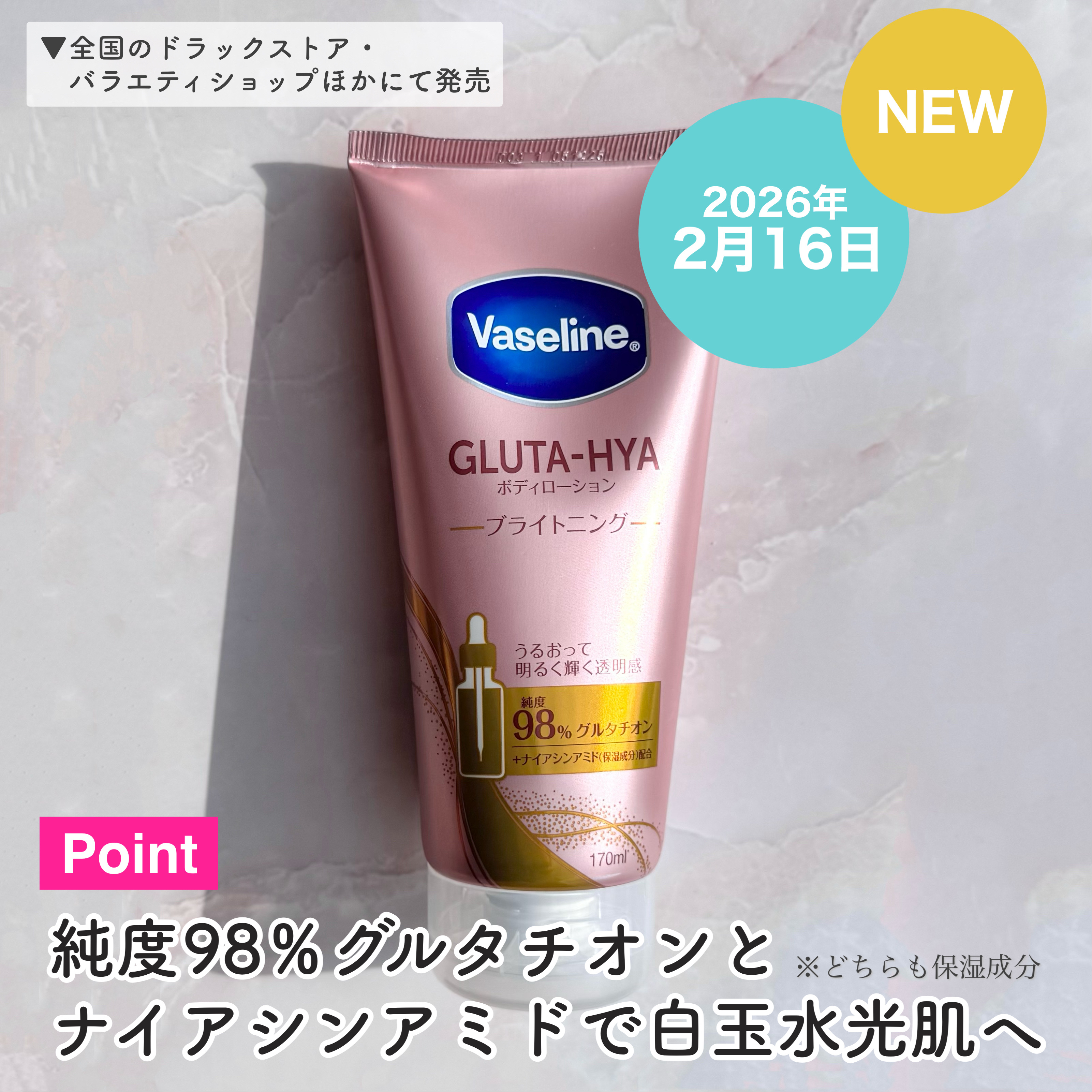 ヴァセリンGLUTA-HYA(グルタヒア)ボディローション ブライトニング海外の方ではすでに発売されてたみたいですね。日本では2月に発売予定。グルタチオン、ヒアルロン酸、ナイアシンアミドなど、こだわりの保湿成分配合。うるおって明るく輝...