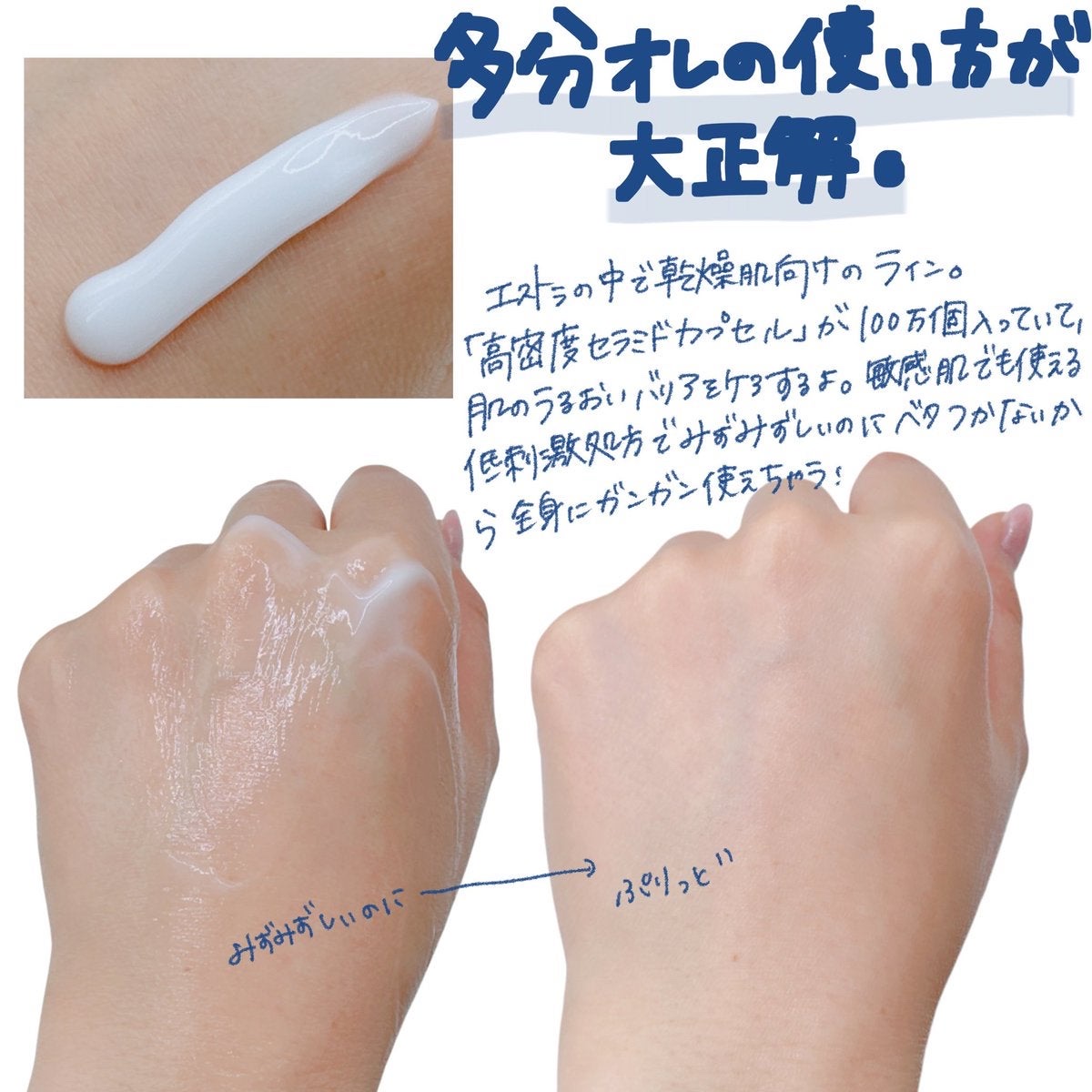 - 独自技術を用いた「高密度セラミドカプセル*¹」を1本に約100万個配合しそのつぶつぶと目に見えるカプセルが肌上で柔らかく溶けて角質層のすみずみまでうるおいで満たします。 保湿が120時間*⁵持続することでも人気を博しており乾燥しやすい敏感な肌におすすめのクリームです。 無香料、無着色、パラベン無添加、エタノール無添加、皮膚科医の協力のもとテスト済み*⁶ *1 セラミドNP、スフィンゴ脂質、ヒドロキシプロピルビスパルミタミドMEA、コレステロール、ステアリン酸、アラキン酸、オレイン酸、パルミチン酸 *5 ㈱エリード 2023.2.20~2023.3.23 敏感肌で乾燥悩みのある女性32人対象の人体適用試験実施(個人差があります) *6 全ての人に肌トラブル、アレルギーがおきないわけではありません。