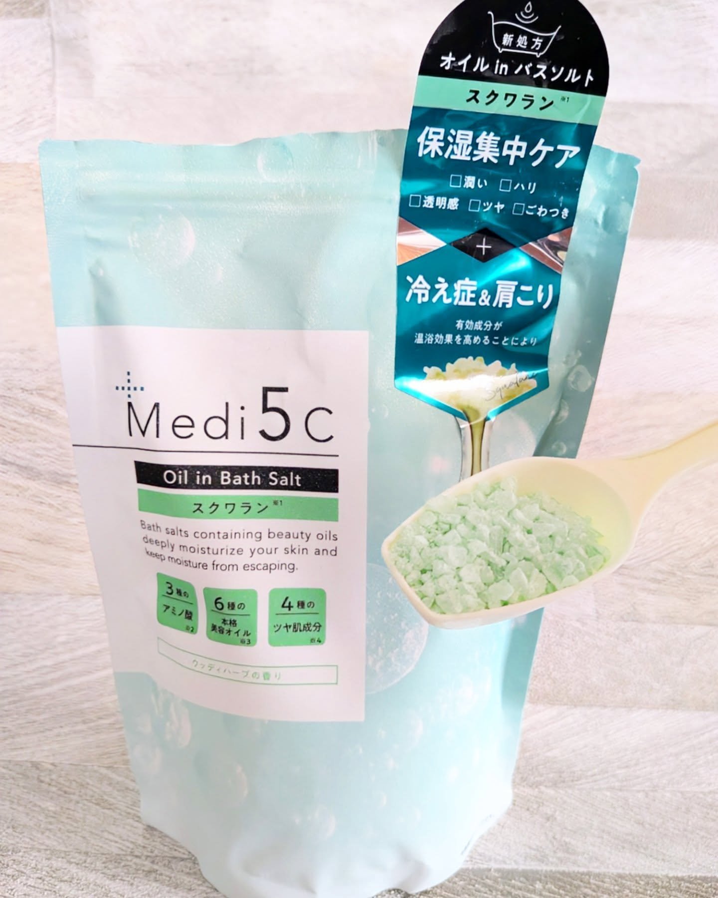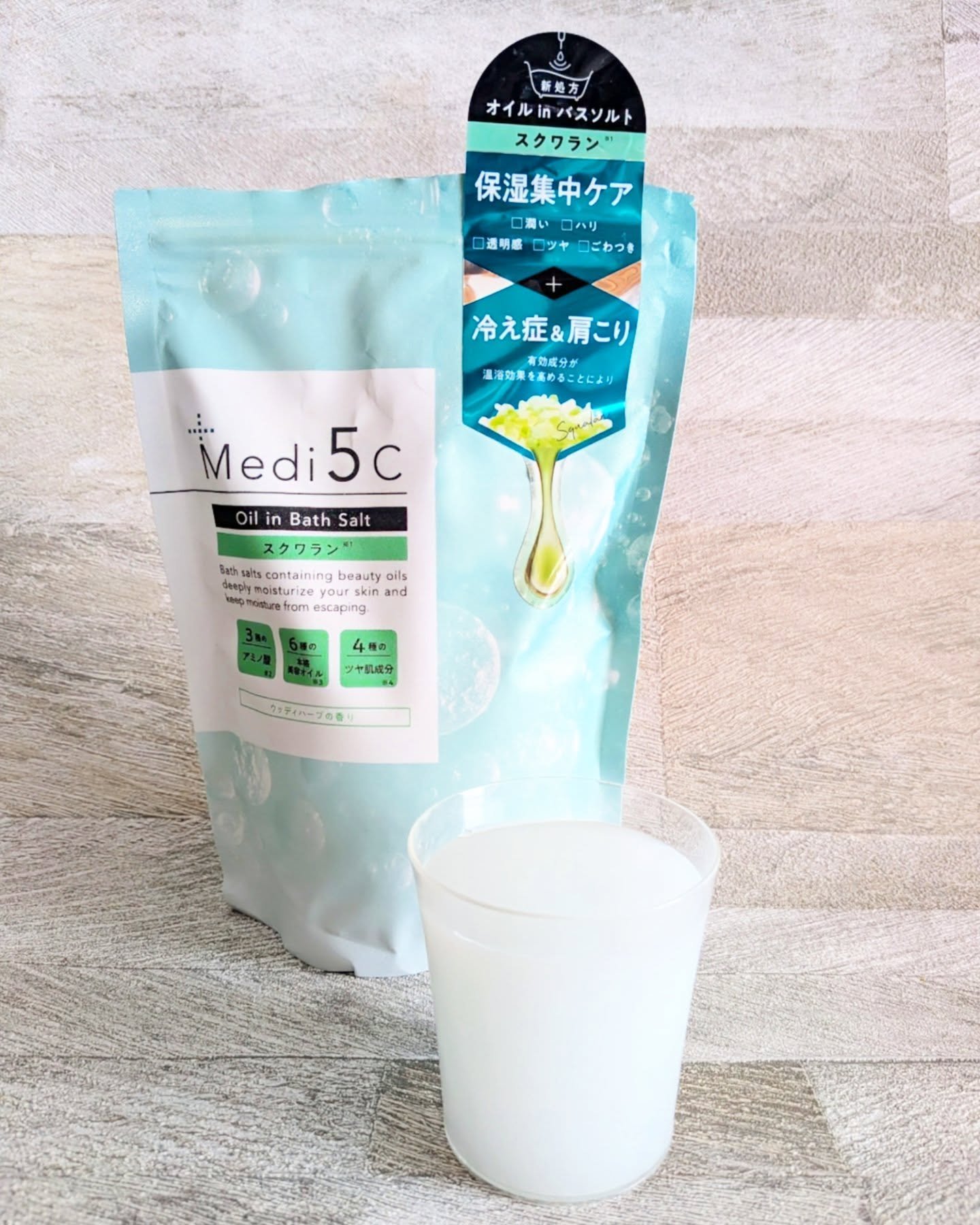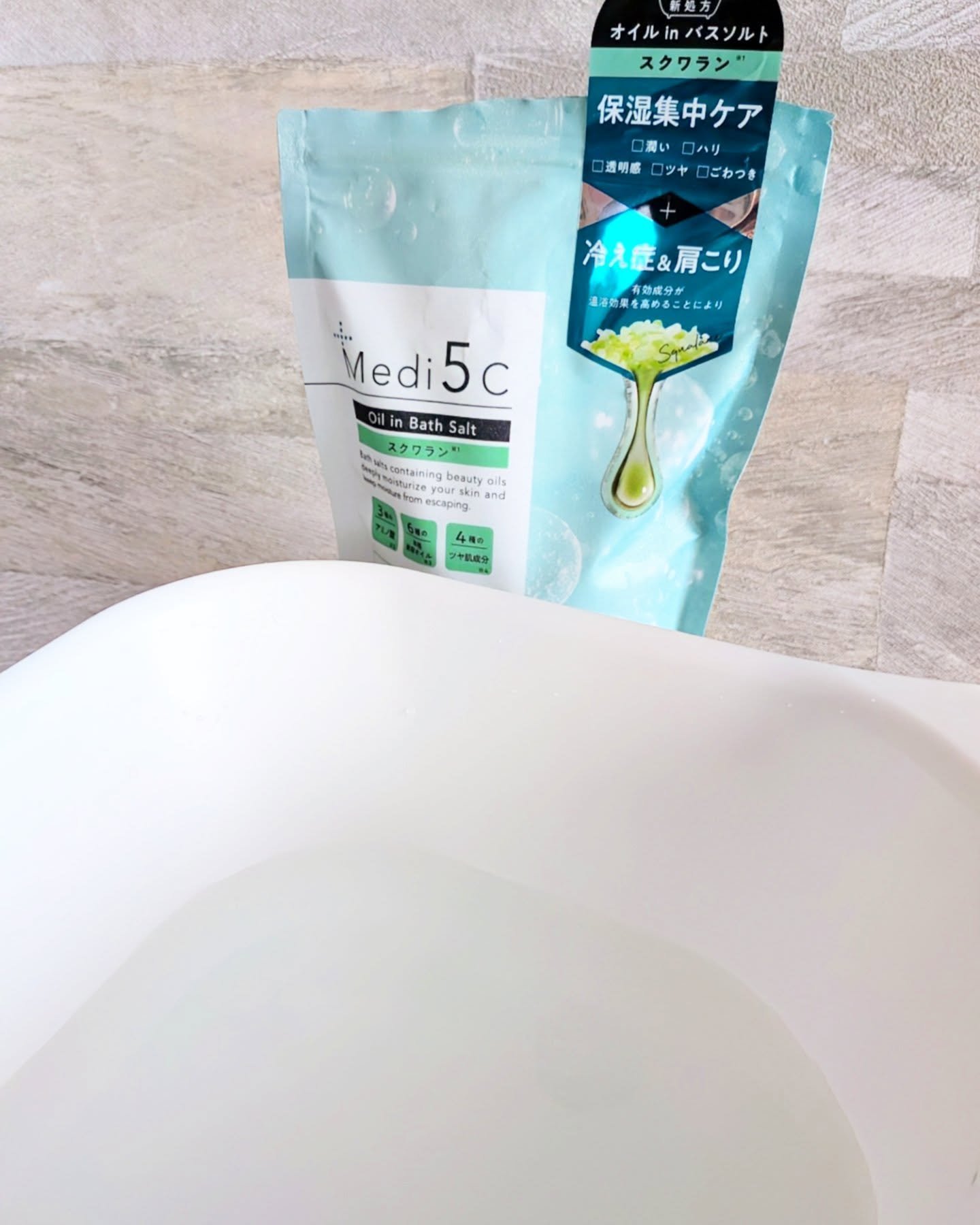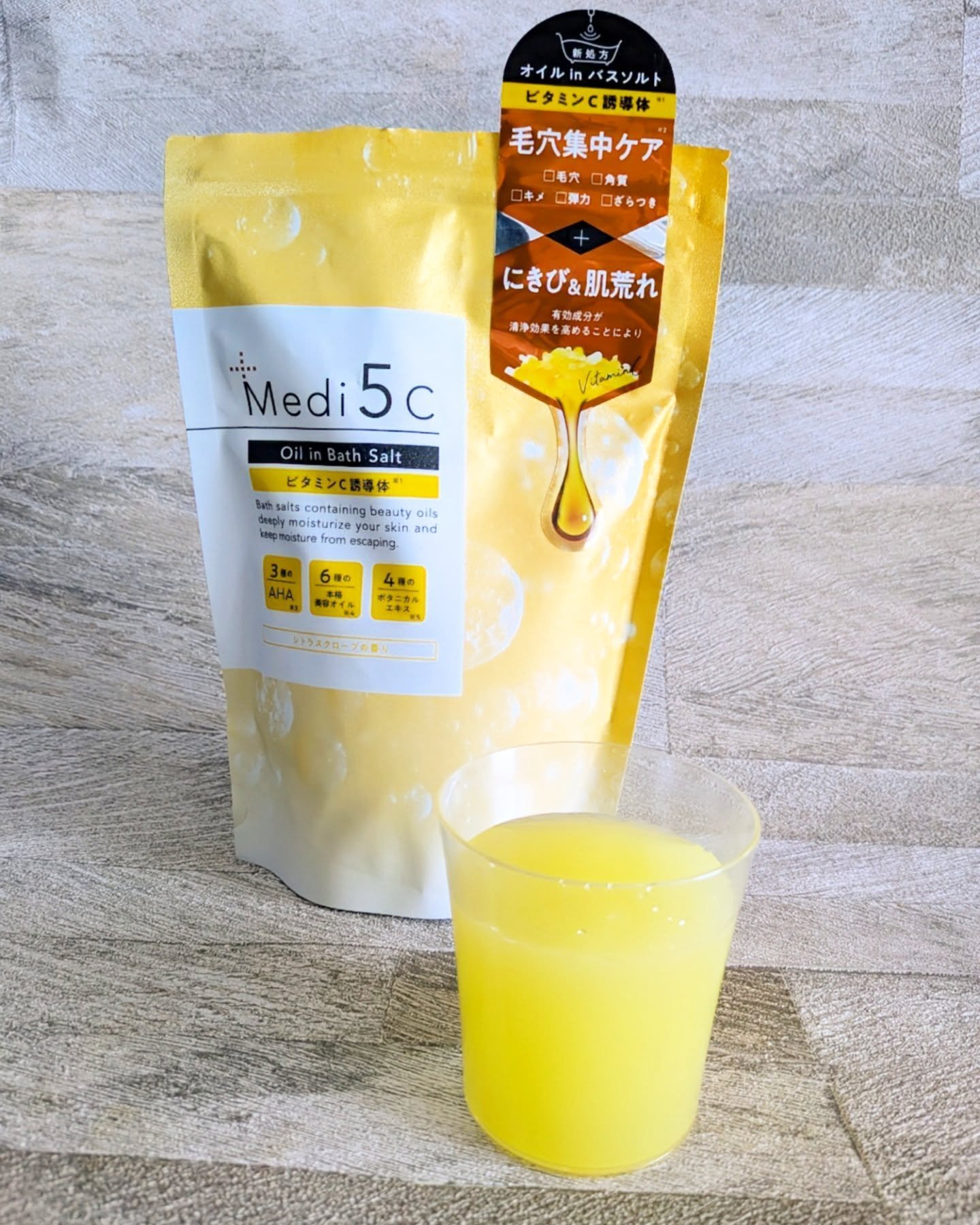 Medi5Cのオイルinバスソルトは本格美容オイルが肌に密着して、潤いをキープして全身をスキンケア出来ます🛁✨ 毛穴ケアに特化したビタミンC誘導体タイプには3種のAHA(リンゴ酸・乳酸・クエン酸)、4種のボタニカルエキスを配合し、毛穴とザラつきをケアしながらキメと弾力のある肌へ導きます✨ オイルinでお風呂上がりも肌がしっとりとなめらかでした🥰