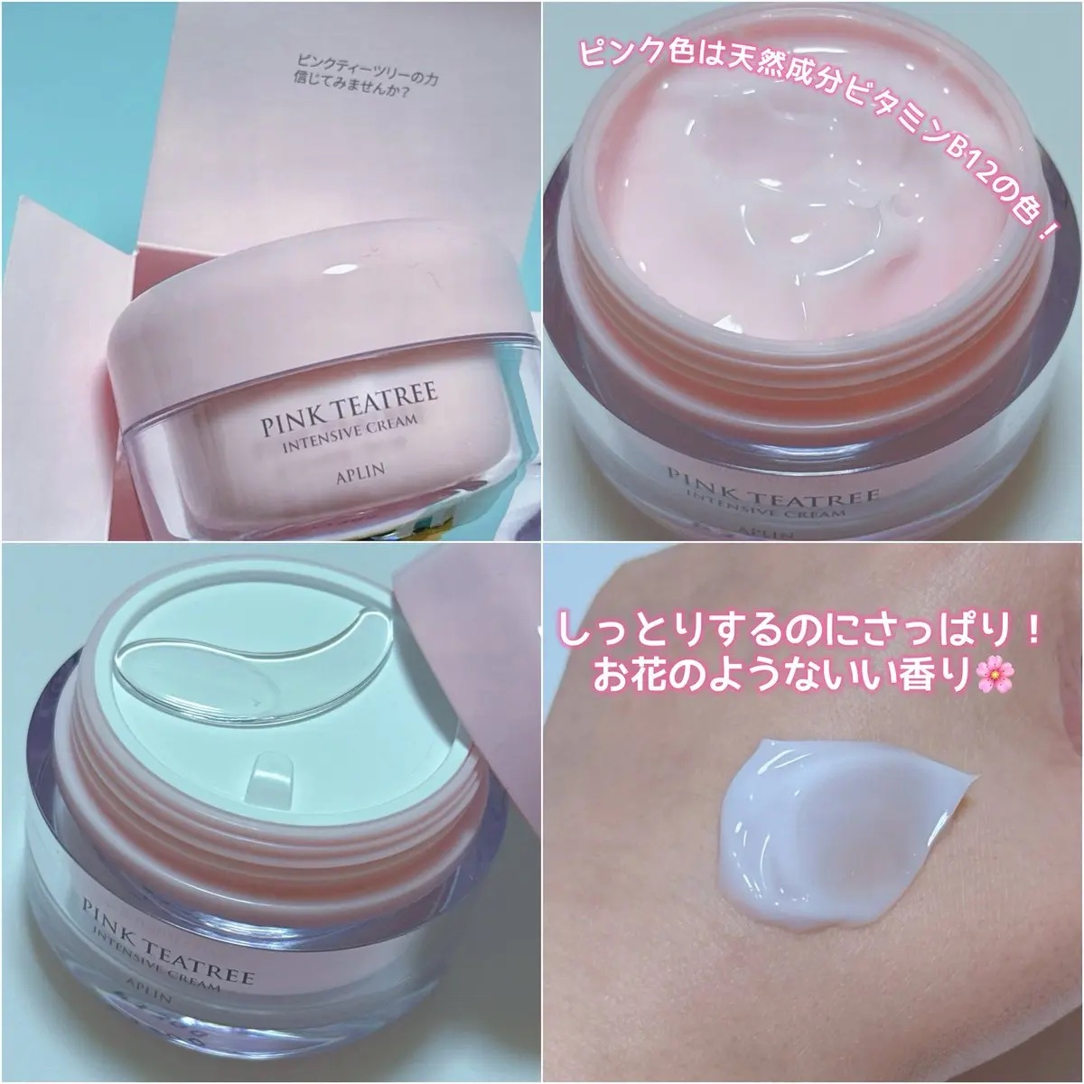 APLINのピンクティーツリーインテンシブクリーム🩰💖ティーツリー&CICA配合で肌トラブルが起きづらい肌に🪄高保湿だけどベタつかずデイリー使いしやすい◎少し多めに塗ればスリーピングマスクとしても使えるよ💫パケも中身もピンクで可愛すぎるんよ、...