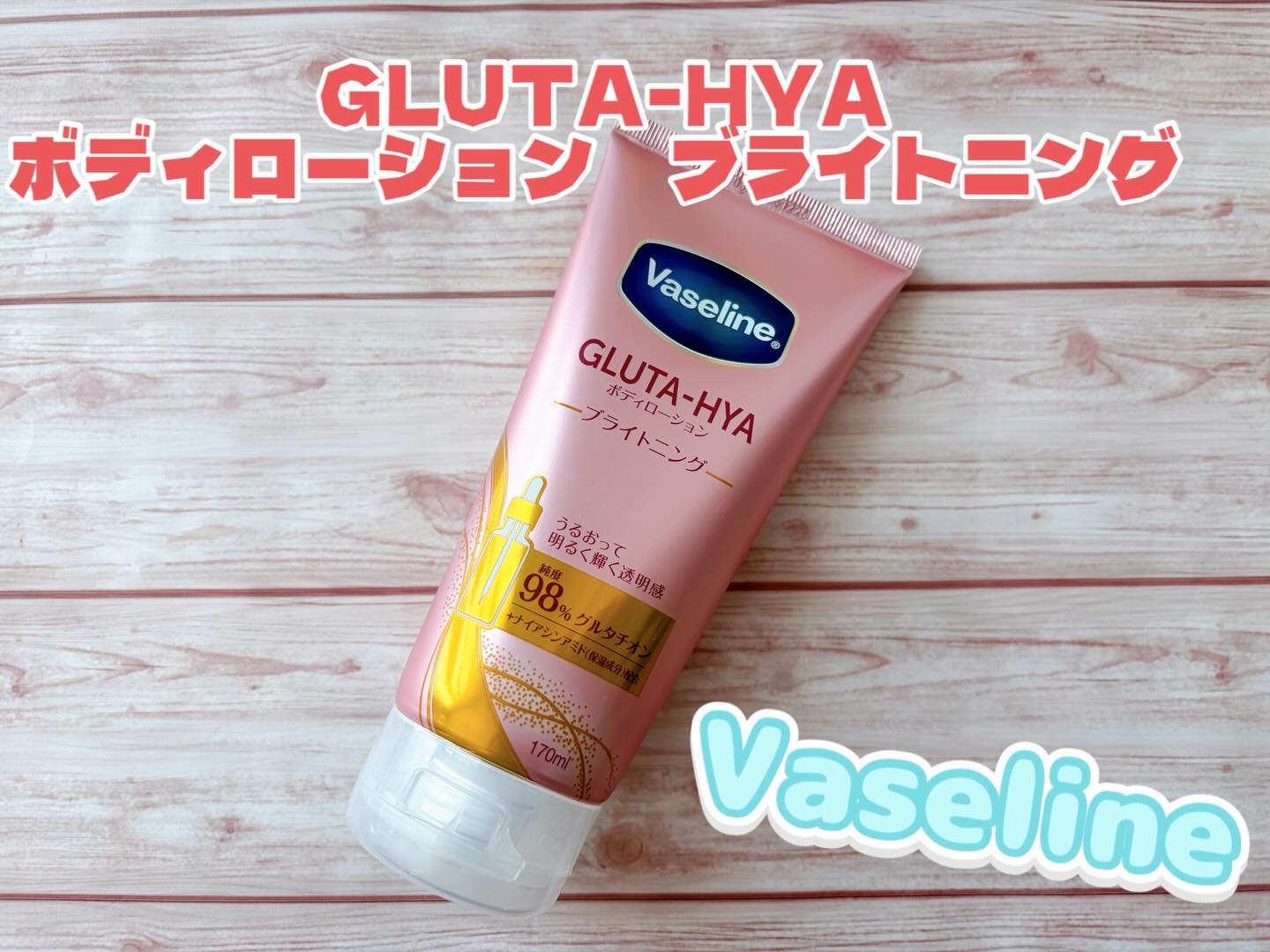 ヴァセリンGLUTA-HYA(グルタヒア)ボディローション ブライトニング純度98%グルタチオン配合のボディローションジェルクリームのようなテクスチャー手に取り出した時はボディローションよりボディ乳液に近い印象でしたでも伸ばしてみる...