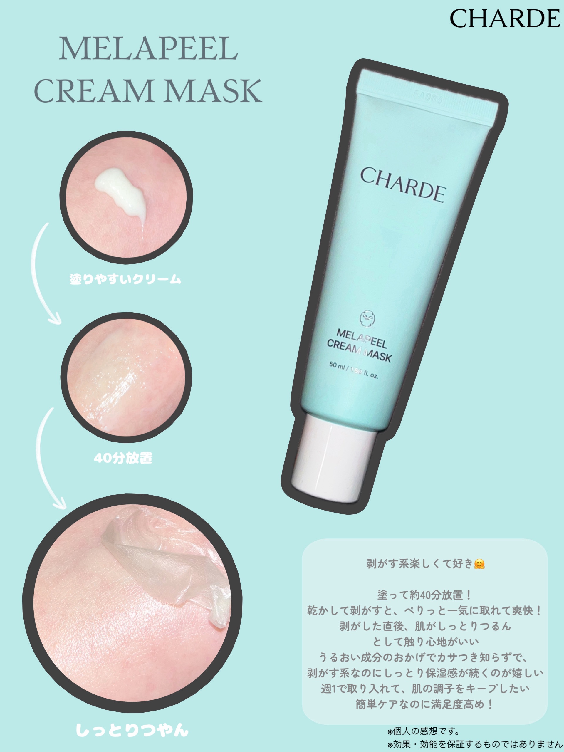 CHARDE(シャルド)のメラピールクリームマスク💗塗って乾かして、はがすクリームマスク❣️手軽で、使い心地が良くて好き☺️🫶🏼アルブチンやグルタチオン、ナイアシンアミド、ビタミンC、レチノール配合。うるおいを角質層まで届けながらメラニンによ...