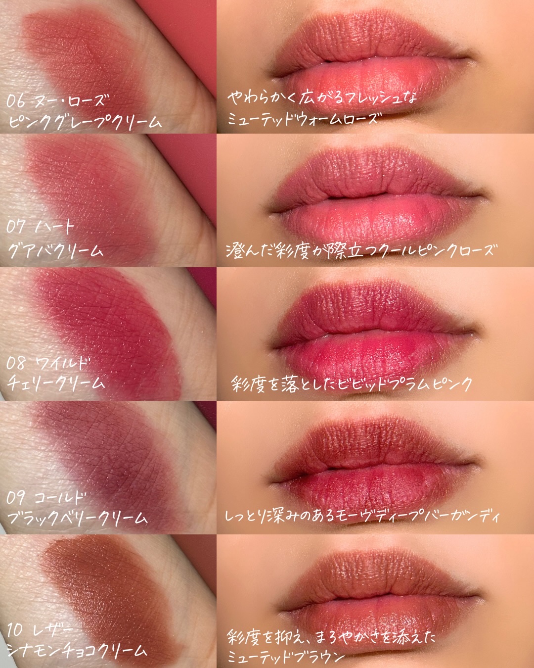 つけたてのときめきと色ツヤが続くルージュ。光の反射をコントロールするクリアグロウパウダーが、にごりのないツヤ膜とクリアな発色を叶え、まるで“朝霧”のように澄み切ったツヤリップを叶えてくれます🥺 潤いを閉じ込めた上質なオイルが唇の温度でやわらかにとろけ、唇を包み込むようにフィットしながら“むっちり”とした弾力感を叶えてくれます! 限定色含む全12色をレビューしました!