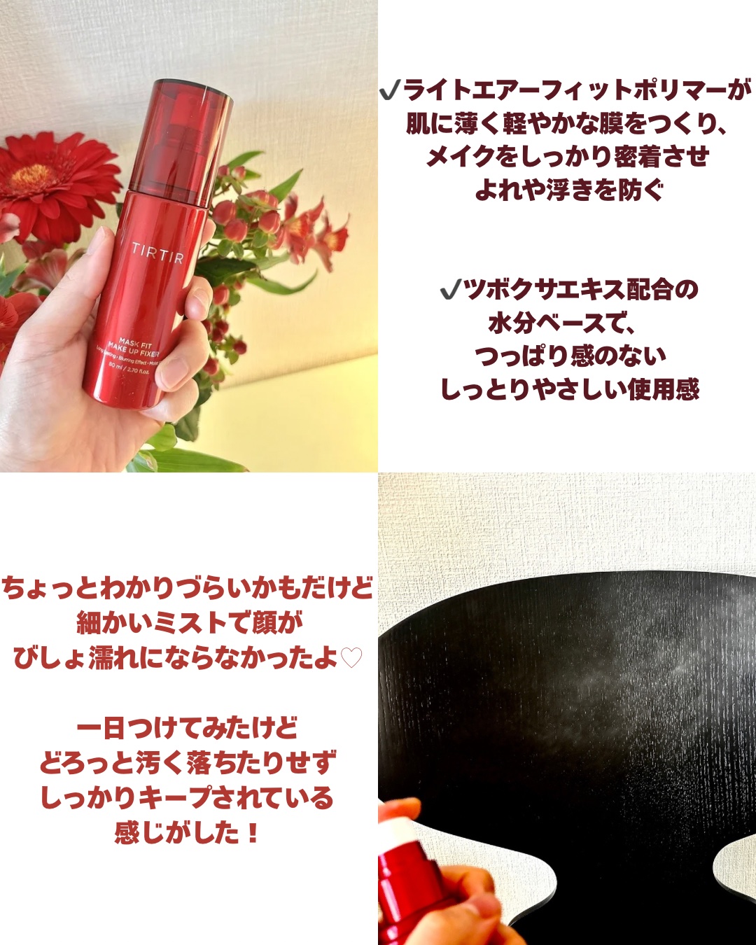 \\\いつでも可愛くいたい子の味方💪///TIRTIR様のマスクフィットメイクアップフィクサー、これからのメイクで絶対使う🔥ミストの粒子細かくてしっかり固定してくれる上に、朝メイクして、夜お酒を飲んだ後でも、ヨレてないし崩れてない!ツヤツヤな...