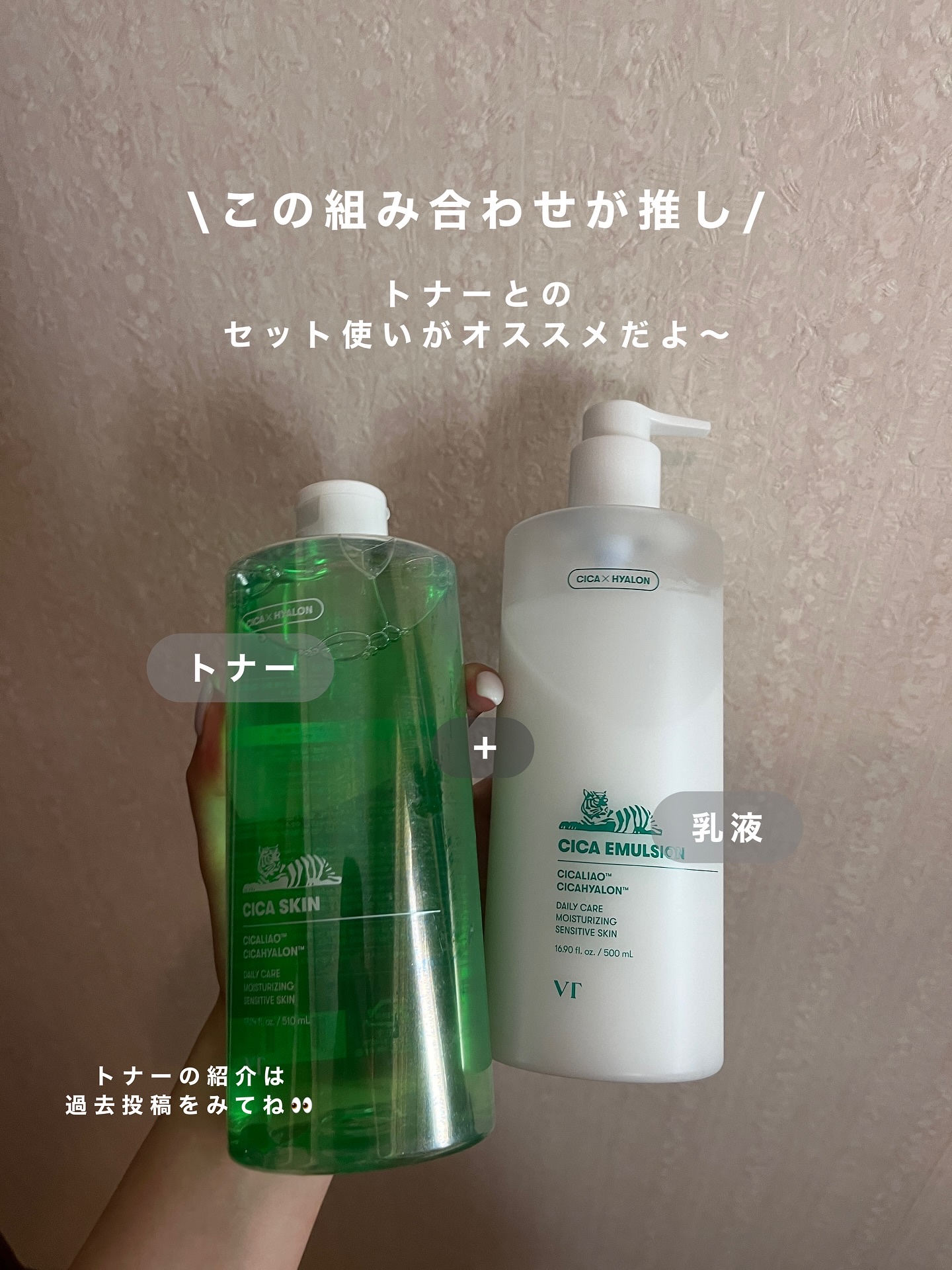 最近使ってる化粧と乳液🥰🥰@vtcosmetics_japan@vtcosmetics_officialの『CICAスキン』と『CICAエマルジョン』🌿♡元々このシリーズのパックを使ってて、初めて化粧水と乳液も買ってみたんだけどすごくよかった...