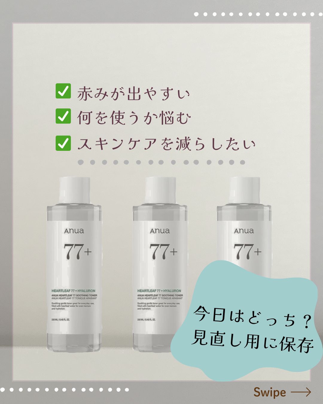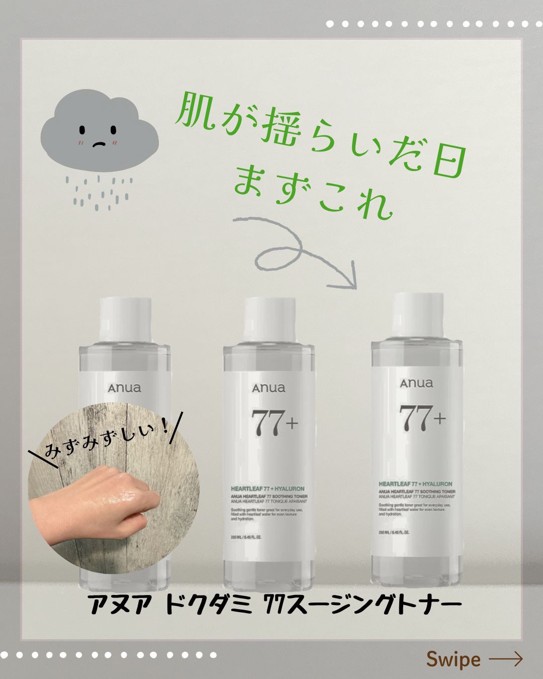 🌿化粧水をつけてもゴワついたり、うまく馴染まない日があって。🌿「水分が足りないのかな?」と思って重ねても、逆に肌が疲れる感じがすることもありました。🌿そんな日は“とにかく潤す”より、荒れにくい状態に戻すことを優先しています。🌿アヌアのドクダミ...