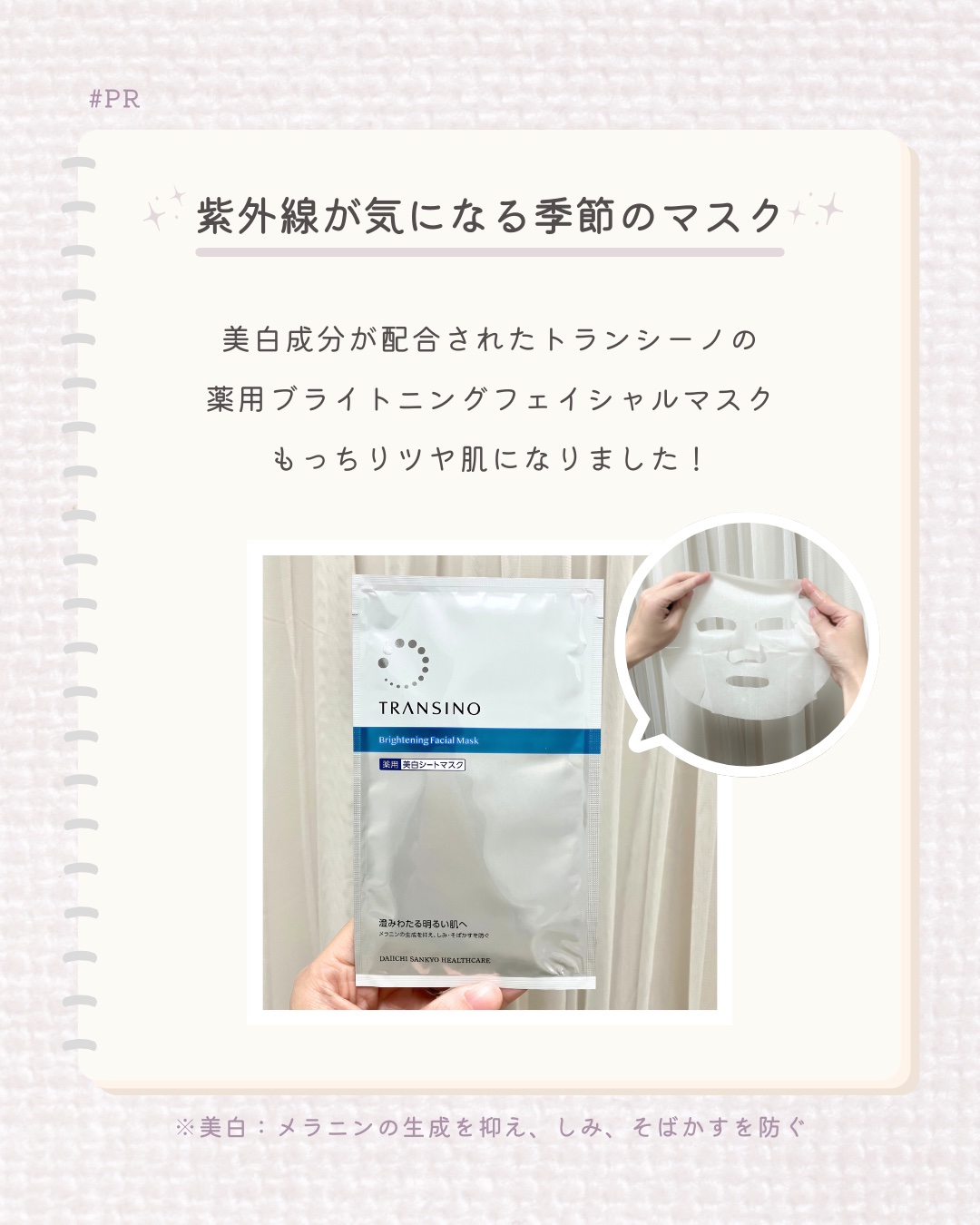 トランシーノさまからいただきましたトランシーノの美白シートマスクが7年ぶりリニューアル!トランシーノ®薬用ブライトニングフェイシャルマスク【医薬部外品】販売名:DSシートマスク10分貼るだけで、すばやく紫外線ダメージを受けた肌をケア。...