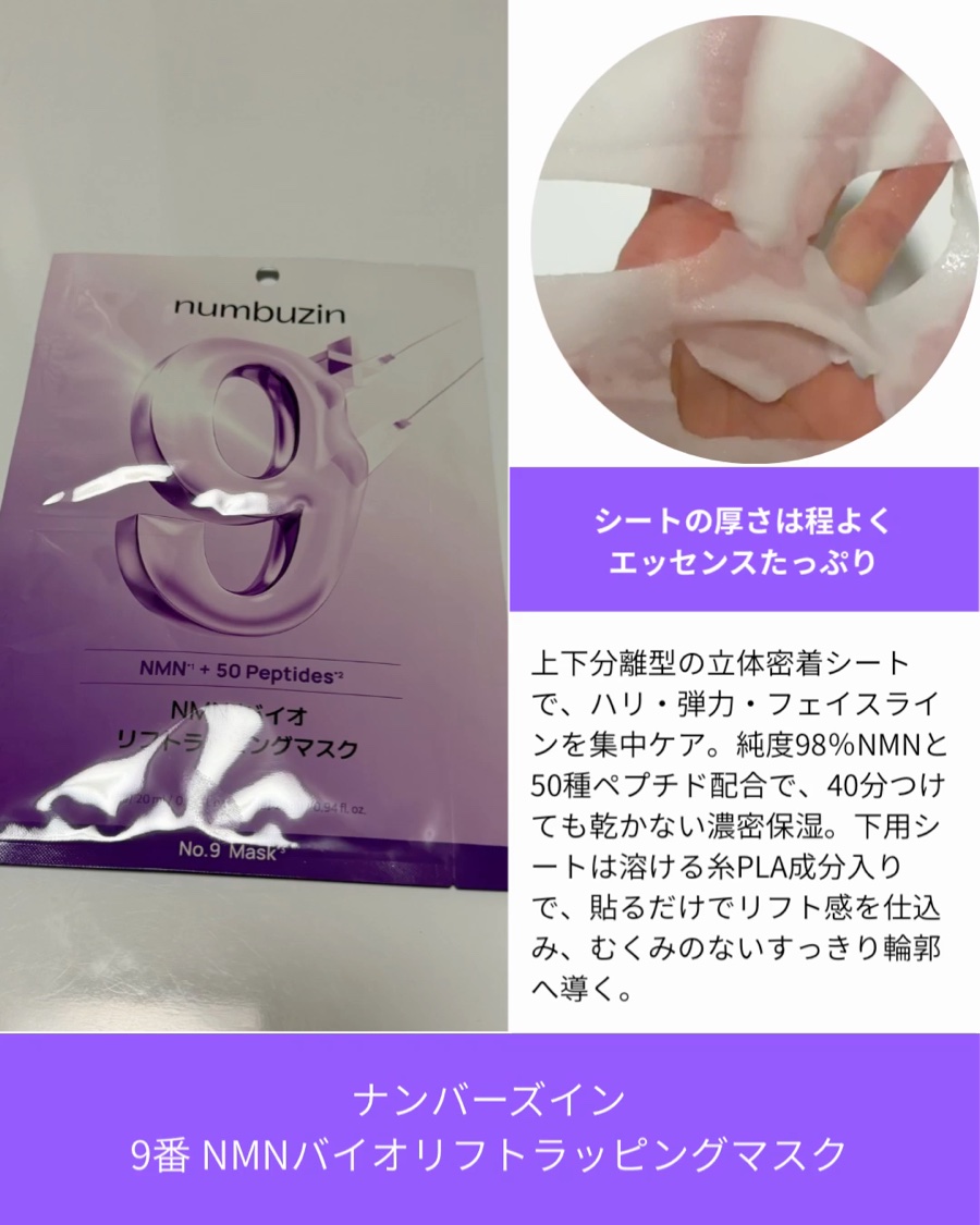 【PR】numbuzinナンバーズインアンバサダー投稿です💜ハリ・弾力ケアでお馴染みの9番ライン✨【9番NMNバイオリフトラッピングマスク】ハリと弾力を一気に仕込んでむくみゼロシートマスク!!上用シート:毛穴・弾力ケアができる純度98%のNM...