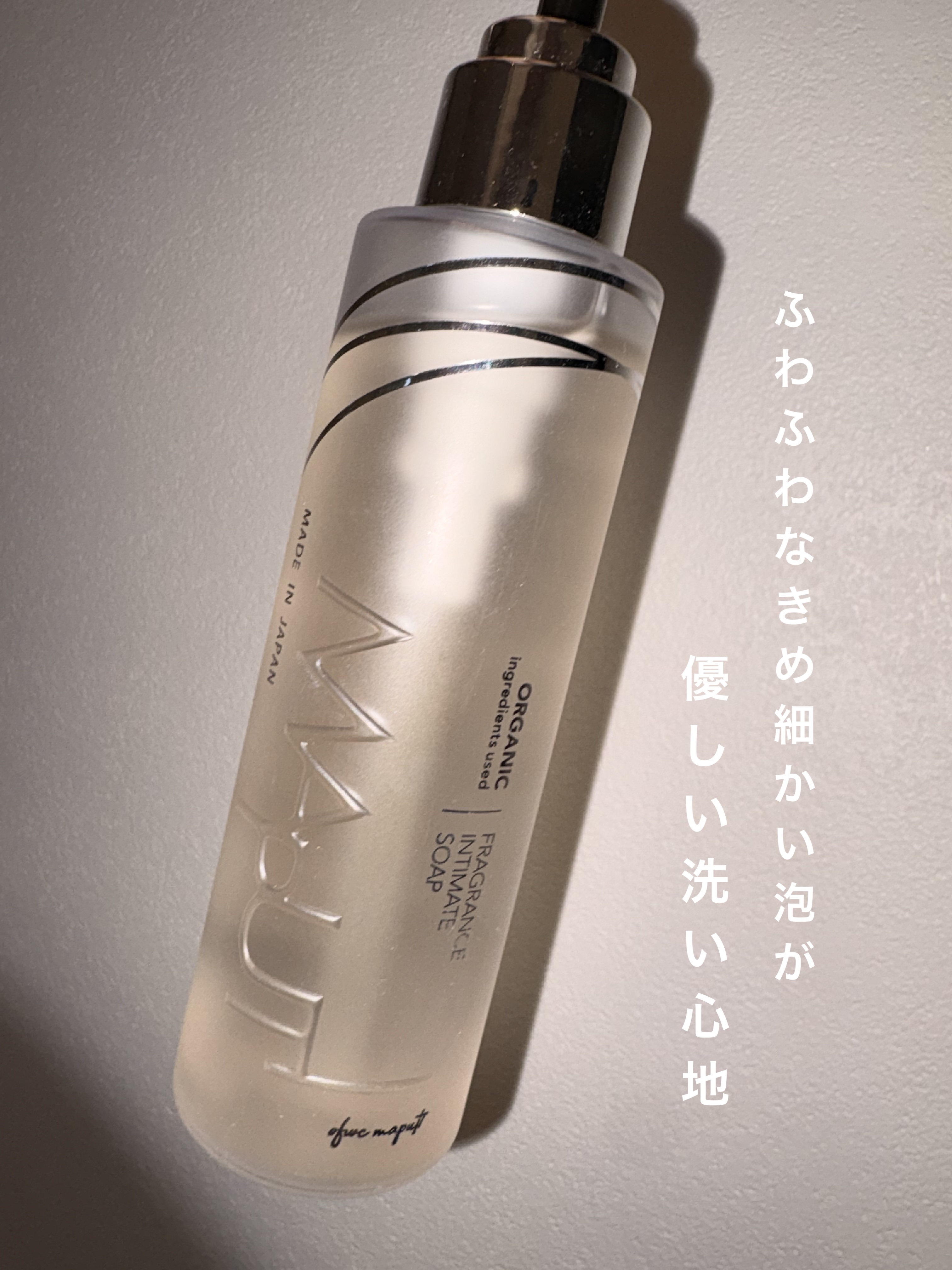 - 「保湿」「泡立ち」にこだわったデリケートゾーン専用ソープ。デリケートゾーンにとって、殺菌力が強いと、悪い菌も殺しますが、良い菌も殺してしまいます。 だから、デリケートゾーンと同じpH値(4.5以内)で作られてる専用ソープを使用する必要があります。 本ソープはアミノ酸系洗浄成分を用い、且つ天然由来成分主体のお肌に非常に優しい使い心地。 デリケートゾーン用ソープとは思えないオシャレな容器で、お風呂場が“映え”ること間違いなし。 また、MAPUTIシリーズ大人気の理由、オリジナルフレグランスも配合しており、長時間良い香りを保ちます。 「肌につけた瞬間の心地良さ」「泡立ちの良さ」「洗い上がりのしっとり感」 是非体感下さい。