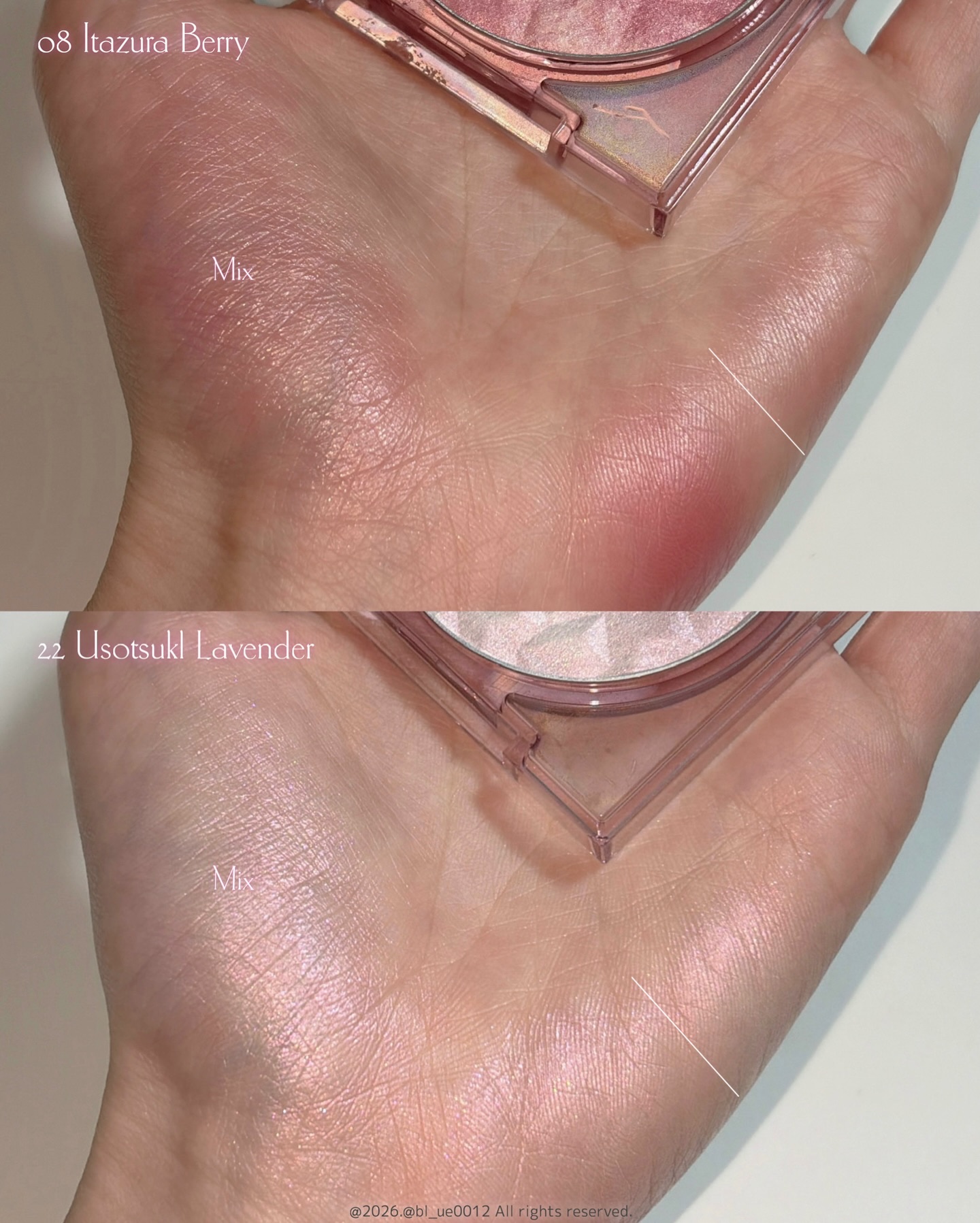 白みをたっぷり含んだカラーがかわいい💜 03 ラベンダープレジャー🫧 上段中央のシマーなラベンダービームのハイライトカラーがとても綺麗だった🥹🤍 トーンを合わせたカラー構成で異なる質感を楽しめるそんなパレットになっています💗
