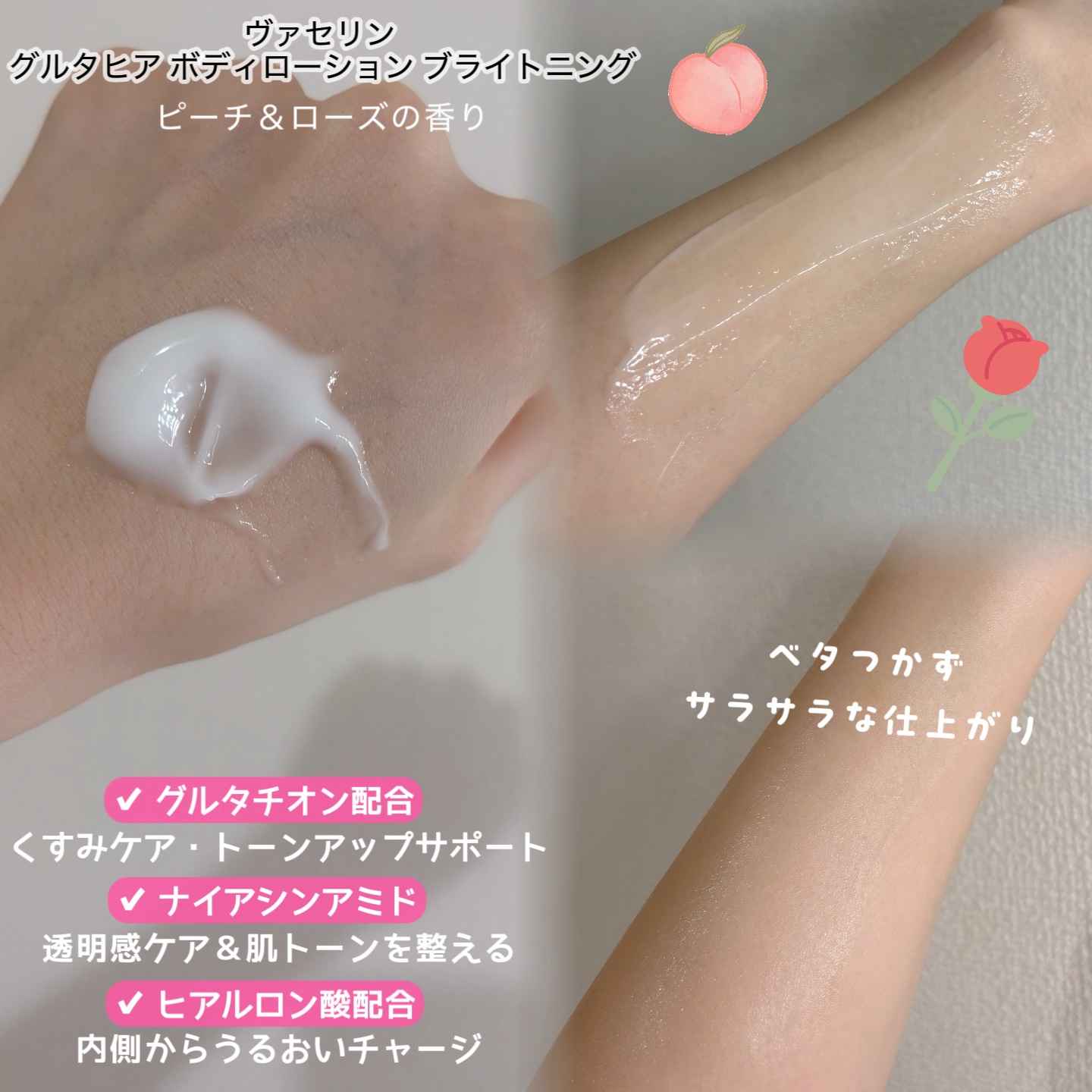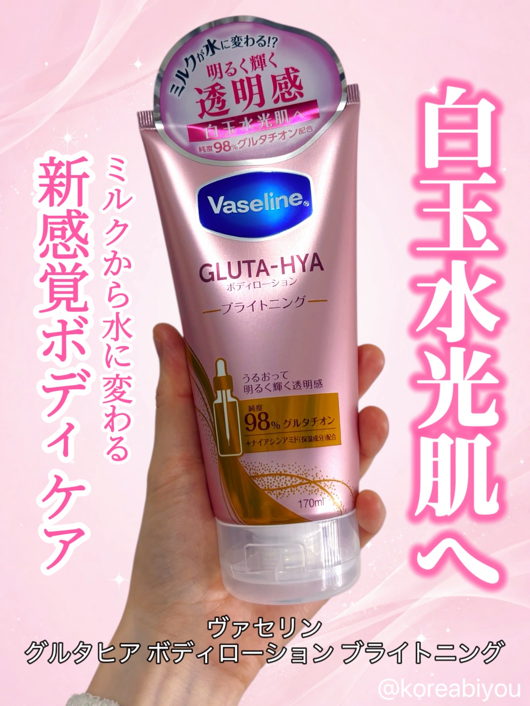 ヴァセリンGLUTA-HYA(グルタヒア)ボディローション ブライトニング海外の方ではすでに発売されてたみたいですね。日本では2月に発売予定。グルタチオン、ヒアルロン酸、ナイアシンアミドなど、こだわりの保湿成分配合。うるおって明るく輝...