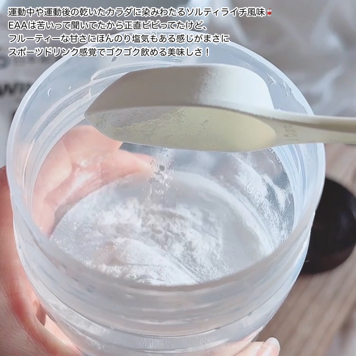 WINZONEEAA「カラダへの浸透性」に着目した浸透型設計のハイポトニック飲料だそうです。ふた付きのボトルがちょうど家にあったので、EAAのさらさらな白い粉末と水を入れてシャカシャカと振ってから飲んでいます。わりとすぐにとけるのがいいですね...