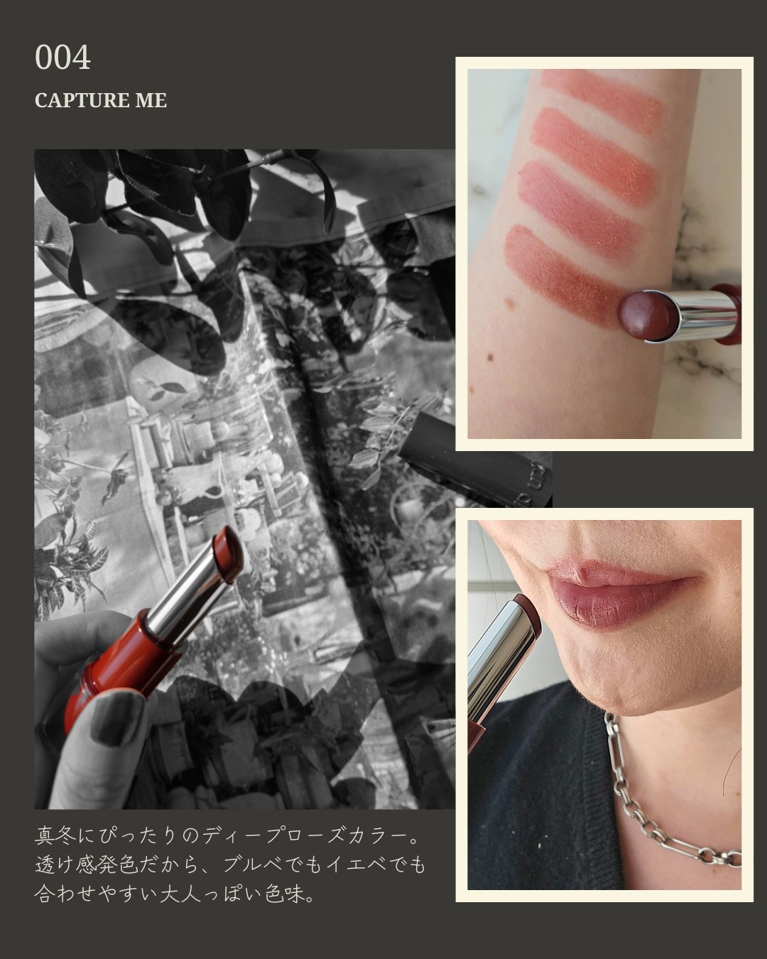 - ぽてっと血色感のある唇、ぎゅっとハグして離さない。なめらかな塗り心地で唇を保護しながら質感・発色つづくプランプ※リップ。※メイク効果 3月19 日より全国の量販店・ドラッ グストアを中心に順次発売* *2026年1月21 日(水)より Maison KOSÉ(EC サイト)にて、1月28 日(水)より全国のマツモトキヨシグループ・ココカラファイングループ(一部店舗除く)、マツキヨココカラオンラインストアにて順次発売開始。