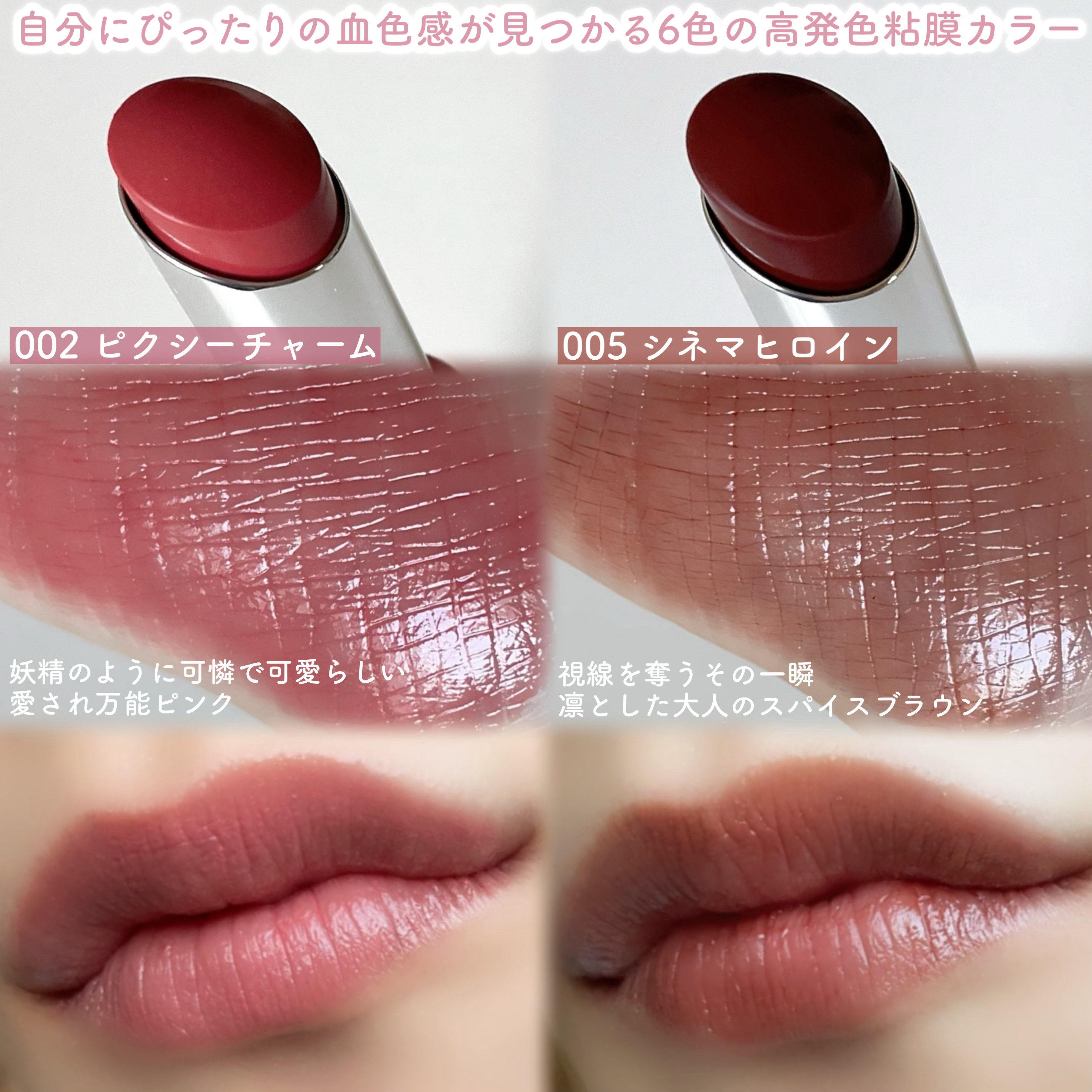 肌にすっと馴染む絶妙ツヤ発色が可愛すぎる なめらかにするする伸びて塗り心地がいい✨ 保湿力が高くてリップクリームいらずなのも 嬉しいポイント🫶🏻 絶妙な発色とむっちりぷるツヤな 仕上がりがたまらない🙉🤍