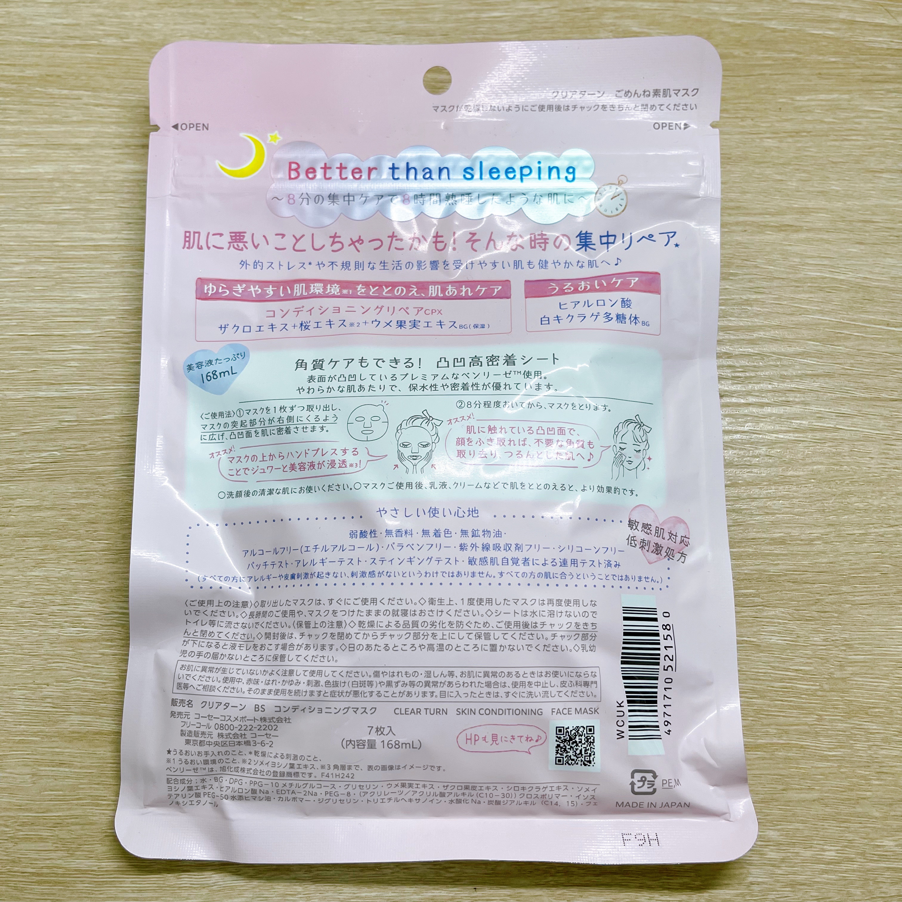 - 【クリアターン ごめんね素肌マスク】 負担をかけて、あれてしまった肌の素肌環境※1をととのえる“速攻集中リペア※2マスク”です。 ① あれがちな肌を素早くコンディションケア! ザクロエキス、桜エキス※3、ウメ果実エキスBG配合し、ゆらぎやすい肌環境をととのえ、肌あれをケアします。また、うるおいケア成分として、ヒアルロン酸、白キクラゲ多糖体BGを配合。外的ストレス※4や不規則な生活の影響を受けやすい肌も健やかでゆらぎにくい肌へみちびきます。 ②敏感肌も使える、弱酸性・低刺激処方 無香料・無着色・無鉱物油・アルコールフリー(エチルアルコール)・パラベンフリー・紫外線吸収剤フリー・シリコーンフリー・パッチテスト済み・アレルギーテスト済み・スティンギングテスト済み・敏感肌自覚者による連用テスト済み(すべての方にアレルギーや皮膚刺激が起きない、刺激感がないというわけではありません。すべての方の肌に合うということではありません。) ③角質ケアもできる!凸凹高密着シート コットン生まれのやわらかな肌触りのベンリーゼを使用。 表面に凸凹のエンボス加工を施しているため、密着性が高く、はがしたマスクでやさしく顔をふきとることで角質ケアもできます。 ※1 うるおい環境のこと ※2 うるおいお手入れのこと ※3 ソメイヨシノ葉エキス、ウメ果実エキスBGはウメ果実エキス・BG(保湿) ※4 乾燥による刺激のこと
