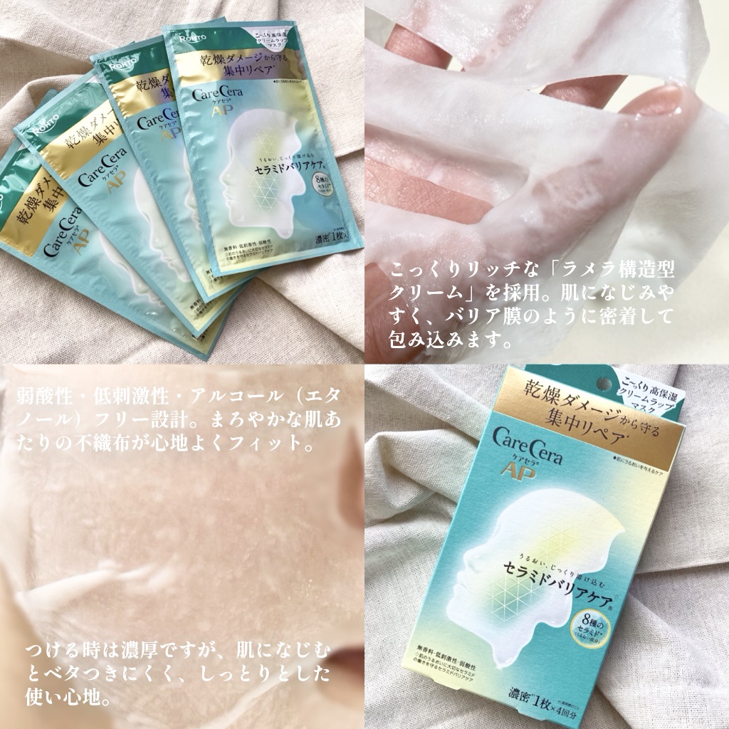 - ① 肌の構造に着目したラメラ構造型※1クリームを含むマスクで包み込む、独自の「クリームラップ処方」 ラメラ構造とは、肌のバリア膜(角層)を構成する細胞間脂質がとる構造です。水と油が層状に並んでおり、肌になじみやすくうるおいを包み込みます。この濃密※2なクリームをマスクに含ませて、肌にラッピングする独自の「クリームラップ処方」を採用しました。パック中はクリームが肌になじみながら広がり、肌を包み込むようにうるおいを封じ込める設計としました。 ②セラミド(うるおい成分)の研究を続けてきたケアセラならではの保湿設計 乾燥しがちな肌へのケアを考えて8種のセラミド(うるおい成分)※4を配合。さらに、角層深くに浸透するセラミドを内包したナノカプセル※5を採用しました。セラミド研究を軸に製品づくりを続けてきたケアセラならではの保湿設計です。 ※4:ジヒドロキシリグノセロイルフィトスフィンゴシン、セラミド6Ⅱ、セラミド1、セラミド2、セラミド3、セラミドEOS、カプロオイルスフィンゴシン、カプロオイルフィトスフィンゴシン、※5:うるおい成分 セラミド3、フィトスフィンゴシン、コレステロール、レシチン、糖脂質 ③ 敏感な肌への肌あたりを考えた「まろやか密着シート」採用 乾燥で刺激を感じやすい肌のことを考え、肌あたりのやさしさに配慮した「まろやか密着シート(ベンリーゼ®)」を採用しました。クリームをたっぷり含み、肌にやさしく密着することで、乾燥が気になる時の集中ケアとして使いやすい設計です。 ※1:肌のバリア層( 角層 )を構成する細胞間脂質の構造の型 、※2:使用感のこと 2026年1月19日(月)より順次、EC(Amazon、楽天、ロハコ、@コスメ、ロート通販)にて先行発売