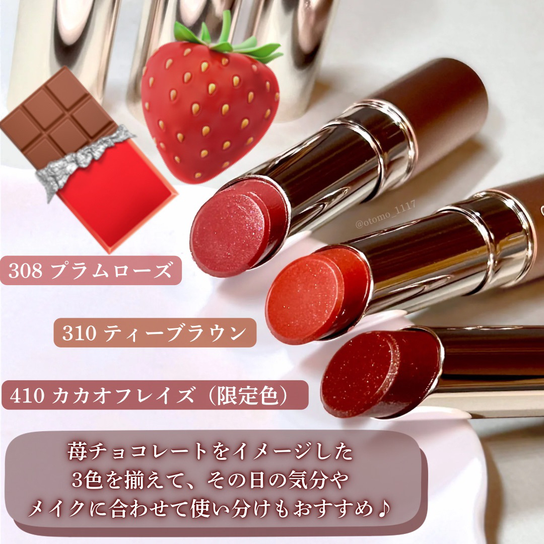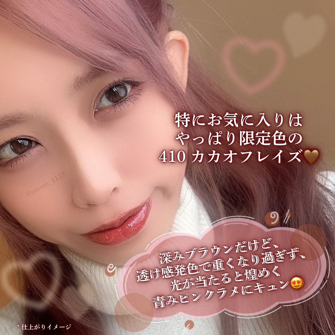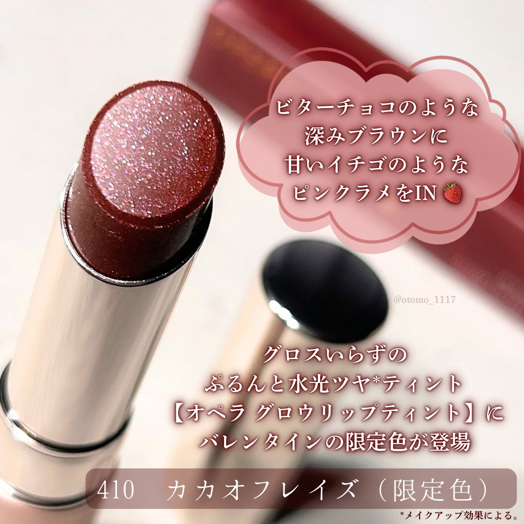 .オペラのティントのバレンタイン限定色410カカオフレイズはピンクラメが入ったチョコレートブラウン🍫🍓フリーズドライのいちごが散りばめられたチョコみたいでかわいすぎませんか…!オペラのリップってかわいらしい感じの色が多いイメージだったけどこれ...