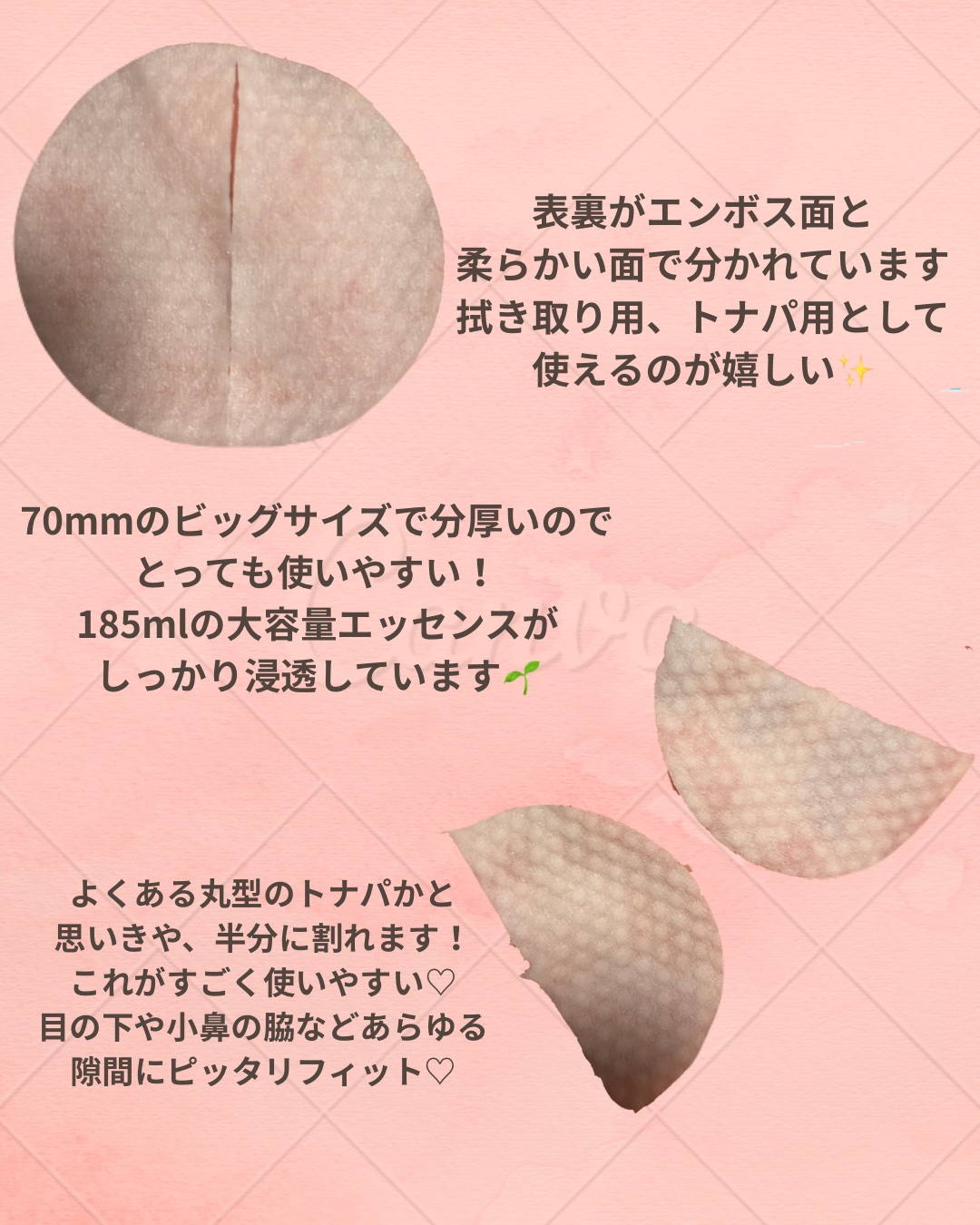 サミュさまからいただきましたSAM'UPHセンシティブトナーパッド生地のサイズと厚みUP2分割パッドで水分・スージングケアが必要な部分に隙間なくピタッと密着メイク前にもピッタリエッセンスたっぷりのトナーパッド2分割パッドの使い方①洗顔後、エン...