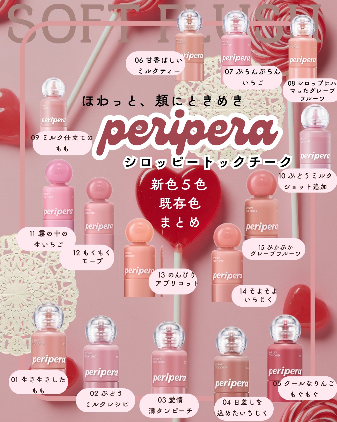 - トン!っとふっくら血色感を演出するシロッピートックチーク クリアにふっくら演出される血色ツヤ感 透明感あふれるシロップテクスチャー 一滴、ポタっ! 血色感演出カラー <01 ライトピーチ> 桃に血色感を一滴、爽やかなピーチピンク <02 ミルキーラベンダー> 糖度100%、ぶどうミルクのように甘いミルキーラベンダー <03 フレンドシップモーブ> モーブに愛をたっぷり込めて~ 愛が溢れるモーブピンク <04 サンシャインフィグ> 日射しを浴びたいちじくのように奥深いムードのローズブラウン <05 クールアップル> まるで採れたてリンゴのように爽やかなアップルレッド <06 ナッティミルクティー> 香ばしいミルクティーのように風味豊かな風雨見豊かなヌーディーベージュ <07 フラッフィーピンク> 甘いストロベリーミルクをたっぷり!ふんわりライトピンク <08 シロップグレープフルーツ> シロップにぼちゃんと浸かった爽やかなオレンジグレープフルーツ 【さつまいもコレクション】 <09 ミルク仕立てのもも(限定)> ミルクが染み込んだようなふんわりクリアなピンクピーチ <10 ぶどうミルクショット追加(限定)> ぶどうミルクにミルクショット追加!甘くてミルキーなピンクラベンダー