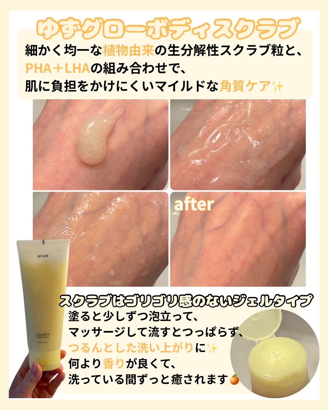 🤍arwe(アルベ)🟡yujaglowbodyscrub🟡yujaglowbodyemulsion韓国のヘア&ボディケアブランド@arwe.jpさまから提供いただきました。《ユズライン》✰肌のキメを整え、ツヤ肌を目指すbodycareライン✰...