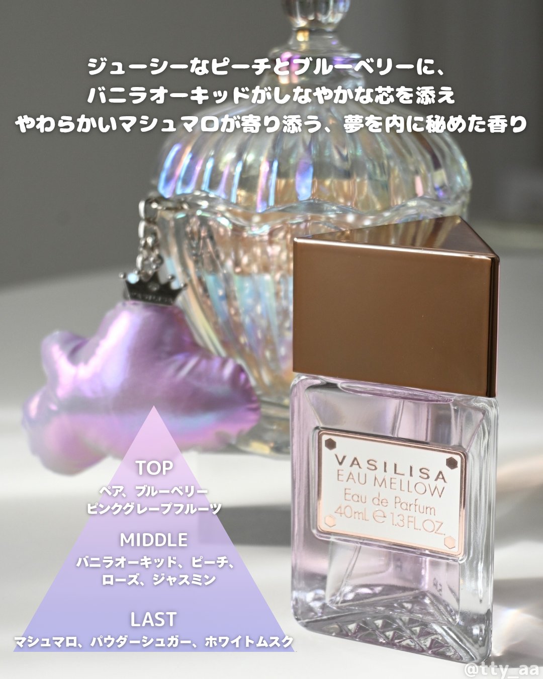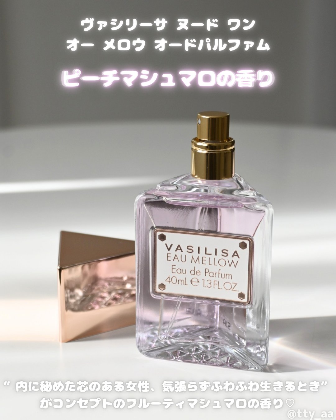 ヴァシリーサから出た新作のマシュマロ香水💟💭⚜️ヴァシリーサヴァシリーサオーメロウオードパルファムフルーティーなブルーベリーやピーチの中に甘さを感じるピーチマシュマロの香り!ふわっとやさしく香るのも使いやすくて好き♡初回数量限定パッケージには...