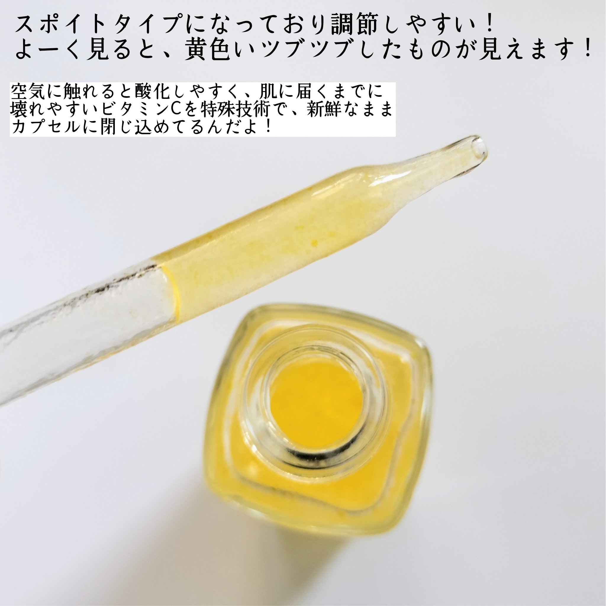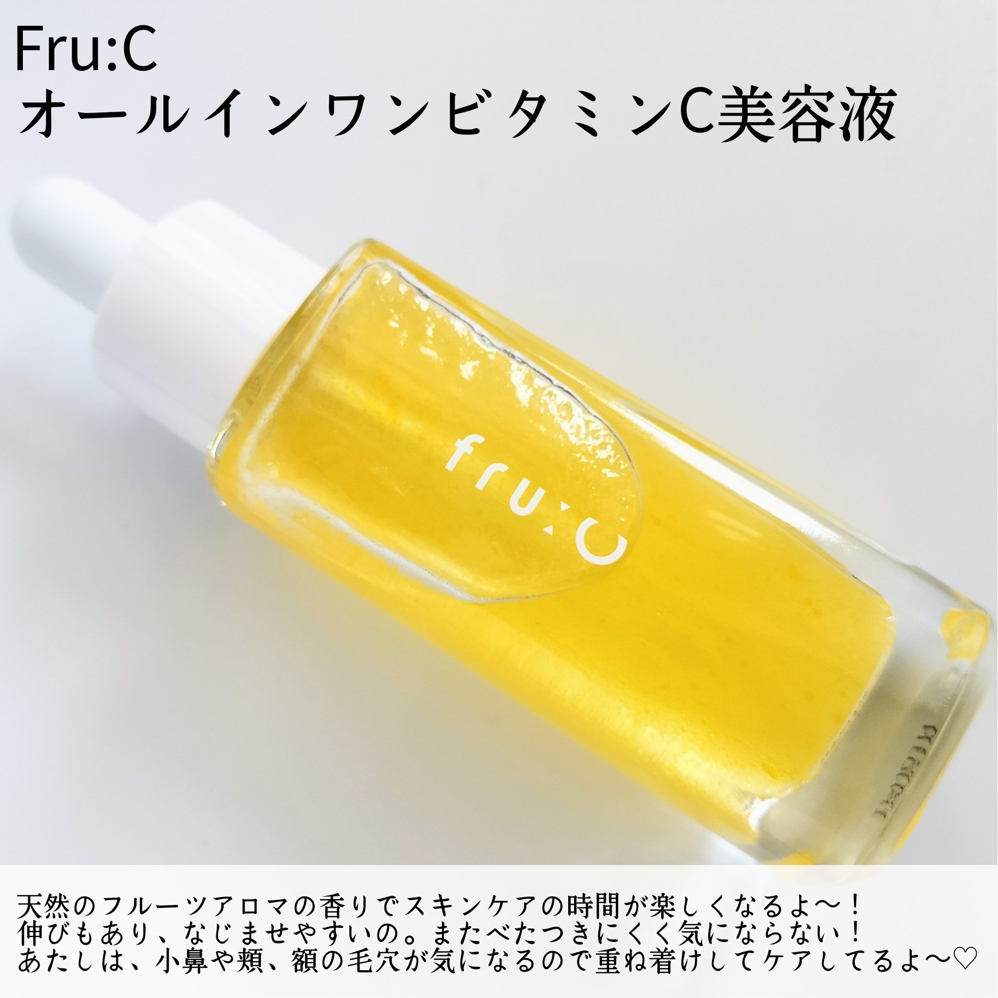 Fru:CオールインワンビタミンC美容液これは自然由来のフルーツエキスとフレッシュビタミンCを凝縮した、まるで果汁のような美容液。シミ、毛穴、くすみ、ニキビ跡、ニキビなど肌荒れにお悩みの方にオススメ。空気に触れると酸化しやすく、肌に届くまでに...